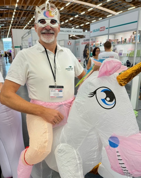 Frank Lieba hatte an diesem Wochenende gleich zwei Aufgaben. Einerseits präsentierte er den Tierärzt:innen das MoeckWarmingSystem®, das das Auskühlen des Patienten verhindert. Die Erkenntnisse aus der Humanmedizinwurden auf die Bedürfnisse von Patienten und Kliniken der Veterinärmedizin systematisch angepasst und weiterentwickelt. "Unser System besteht aus einem Warmluftgerät sowie wiederaufbereitbaren Wärmeunterlagen, um den Körperkern des Patienten im normothermen Bereich zu halten", erklärt Frank Lieba, der in den Pausen eine recht gute, vor allem aber auffällige Figur auf dem Rücken des Einhorns machte. Mehr Infos: https://moeck.at //www.moeckundmoeck.de