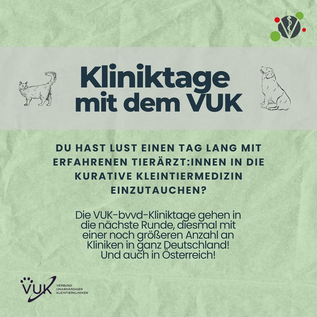 Die junge Generation der kurativen Kleintiermedizin steht im Mittelpunkt der fünften Auflage der bvvd-VUK-Kliniktage. Die Veranstaltung wird einmal jährlich vom Bundesverband der Veterinärmedizin-Studierenden in Deutschland e. V. (bvvd) gemeinsam mit dem Verbund Unabhängiger Kleintierkliniken e. V. (VUK) organisiert.