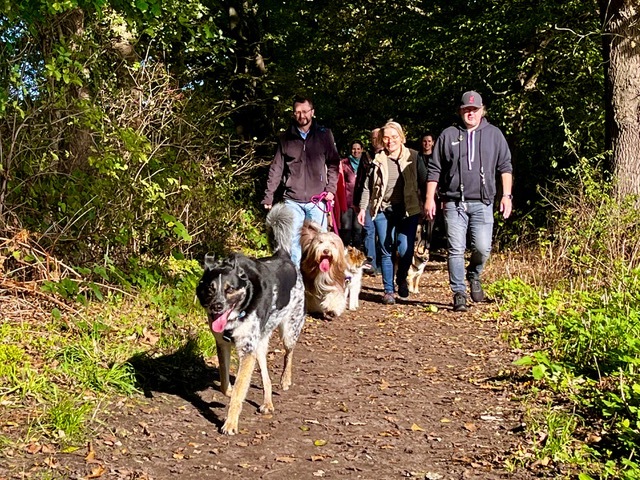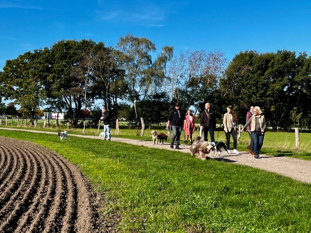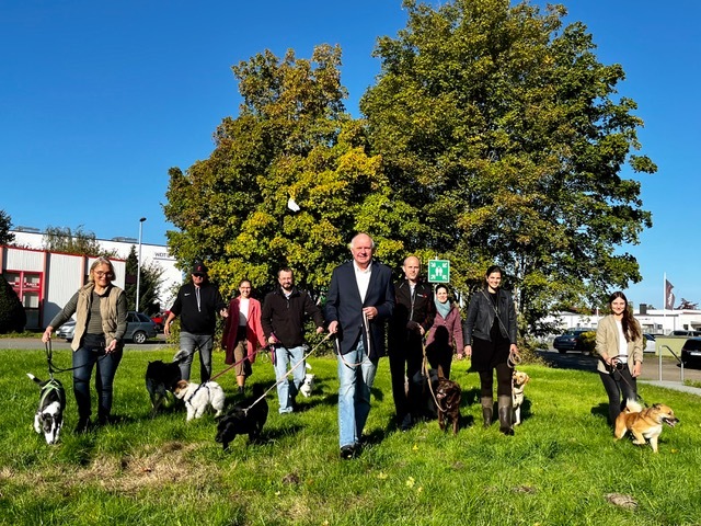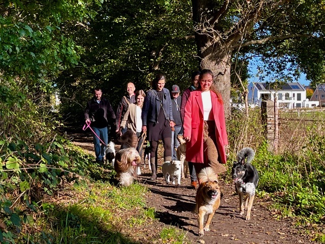 Auf einer der regelmäßig in der Mittagszeit stattfindenden Hunderunden durfte Verleger Andreas Moll und seine zehnjährige Mischlingshündin Pepples dabei sein. Zu Beginn noch herrschte große Unruhe und freudige Nervosität sowohl unter den Zwei- und den Vierbeinern. Doch, nachdem das Willkommensfoto im Kasten und die ersten Meter der Gassirunde gegangen waren, entspannten sich alle, genossen Luft und Sonne und kamen miteinander ins Gespräch.