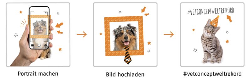 Nach dem Hochladen das Bild auf Social Media teilen und dabei den Hashtag #vetconceptweltrekord verwenden -> Vet-Concept spendet einen Betrag an Hilfsorganisationen. 1 Hashtag = 1 Spende. Jeder veröffentlichte Beitrag mit dem Hashtag zählt – also: Teilen, markieren, Gutes tun!