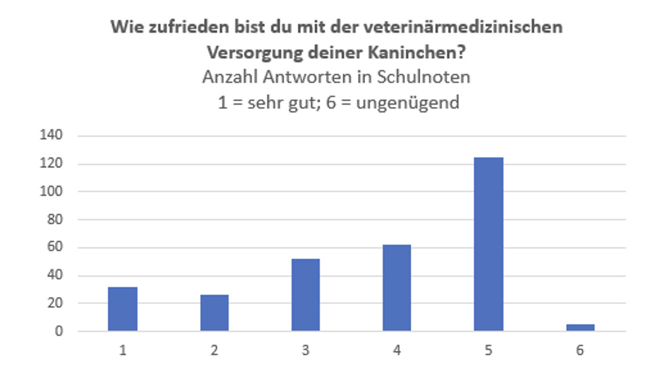 172 Mitglieder haben geantwortet. Kein einziger der Teilnehmer:innen empfand die Versorgung von Kaninchen im Vergleich zu Hund bzw. Katze „etwas besser“ oder „deutlich besser“. Die Kaninchen von 7,6 % der Halter:innnen haben eine „genauso gute“ tierärztliche Versorgung wie bei Hund bzw. Katze erhalten, 26,2 % der Halter:innen fanden die Versorgung ihrer Kaninchen „etwas schlechter“ und 66,3 % „deutlich schlechter“ als die ihrer Hunde bzw. Katzen.