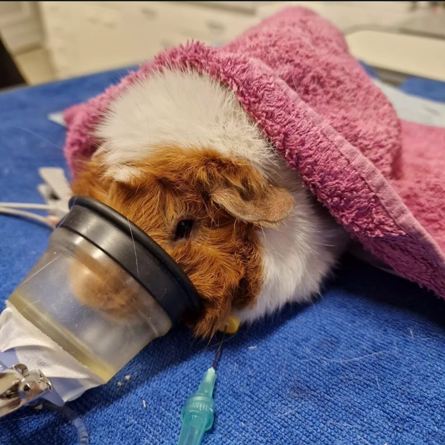Meerschweinchen “Flöckchen” wurde 2022 mehrfach mit haarlosen Flanken und deutlich palpablen Ovarialzysten (sehr klein bis hin zu Hühnereigröße) vorgestellt. Ein erster Behandlungsversuch mit HCG war erfolgreich, aber nach 3 Monaten waren wieder Ovarialzysten tastbar mit deutlichen hormonellen Auswirkungen (kahle Flanken, sehr aggressiv gegenüber den Partnertieren, wechselnde Kotkonsistenz), so dass sich die Besitzer:innen für eine Ovarektomie entschieden haben. Am Tag der OP wurde ein Röntgenbild laterolateral angefertigt, um eventuelle Komorbiditäten auszuschließen und eine Flotation einer S