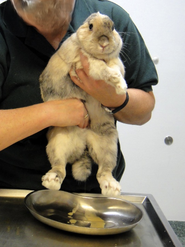 - Tier vorne anheben, Blaseninhalt aufschütteln, sanft ausmassieren (Abb. 1)