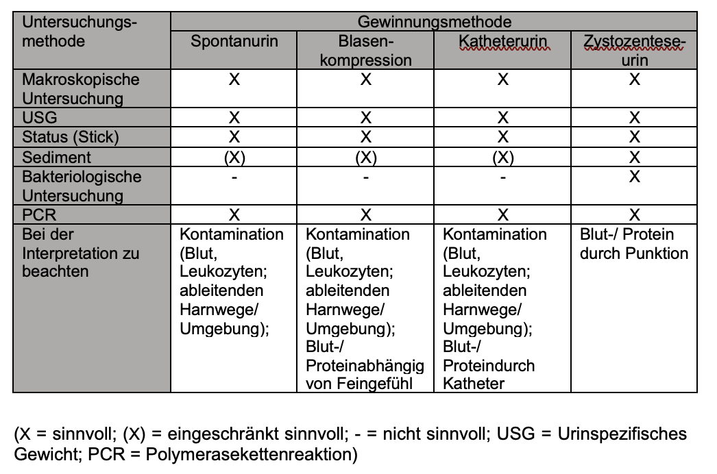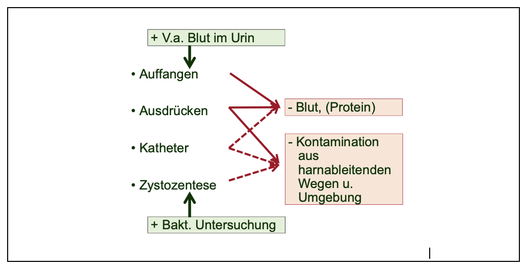 Bei Verdacht auf eine Blutung ist nur Spontanurin sinnvoll, da sowohl die Blasenkompression (abhängig vom Feingefühl + bis +++ Blut), als auch Katheterisieren oder Punktion (i. d. R. 1+ Blut) zu positiven Protein- und Blutergebnissen führen. Bei Verdacht auf eine bakterielle Zystitis ist nur Zystozenteseurin aussagekräftig, da es hier nicht zu einer Kontamination mit Leukozyten oder Bakterien aus den ableitenden Harnwegen und bei Spontanurin auch aus der Umgebung kommen kann (Abb. 2).