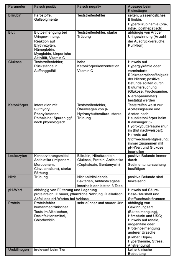 Die meisten Urinteststreifen sind aus der Humanmedizin und daher nicht uneingeschränkt beim Tier anwendbar. Fast alle Teststreifenparameter sind beeinflussbar und zu falsch positiven oder falsch negativen Ergebnissen führen (Tab. 2).