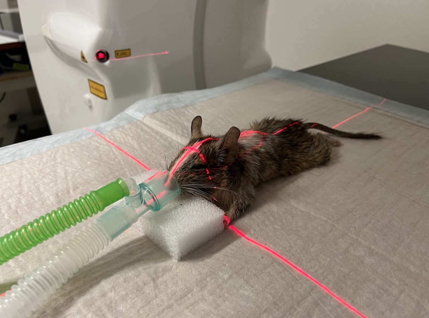 Der 3-jährige, 166g schwere, männlich kastrierte Degu (Octodon degus) Moritz wurde vorgestellt für eine Zahnkorrektur, da er etwas schlechter gefressen hat. Gleichzeitig zeigte er auch Niesanfälle und leichte Dyspnoe seit ein paar Tagen, war laut Besitzerin vom Allgemeinzustand aber sonst gut.