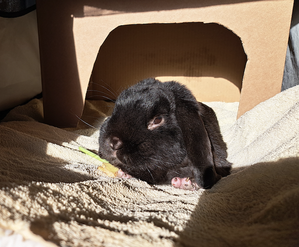 Ein besonderes Augenmerk galt der weichen Haltung, da ohne eine Polsterung der Wunden eine Heilung nicht voranschreiten würde. Auch wurden die Verbände an den Vordergliedmaßen oft nach wenigen Stunden durch das Kaninchen wieder heruntergezogen.Alle Flächen im Käfig wurden mit ca. 6 cm dicken Schaumstoffplatten ausgelegt, die durch Inkontinenz-Kopfkissenbezüge und Handtücher vor Urin geschützt wurden. Dies ließ sich kostengünstig durch die Ausschlachtung einer alten Matratze und der Bestellung der Bezüge bei einem bekannten Onlinehändler realisieren. Wechselnde Häuschen aus Pappkartons dienten als Unterschlupf und boten Abwechslung.