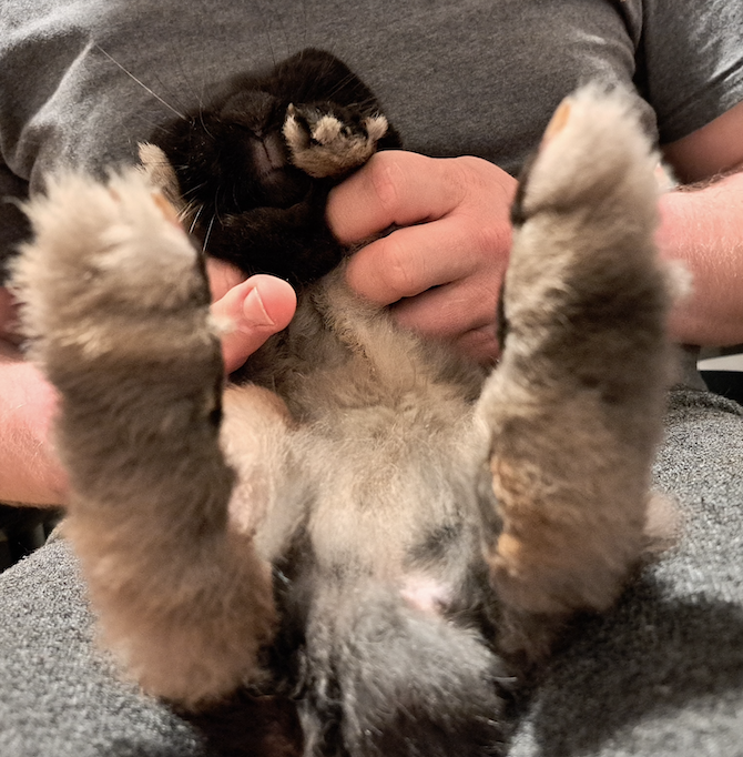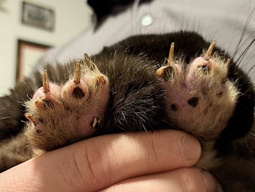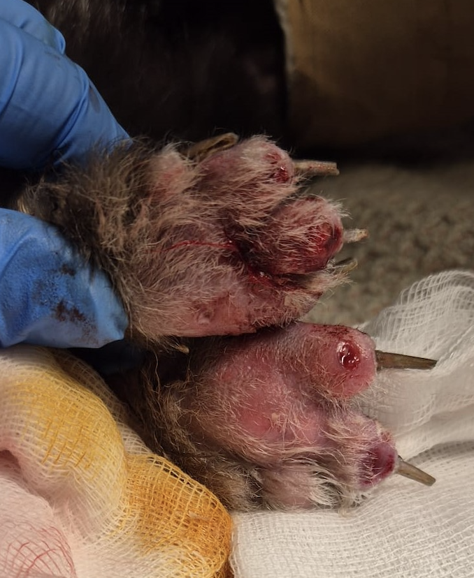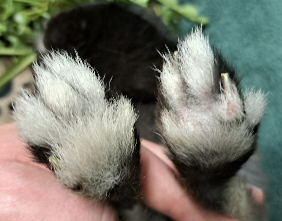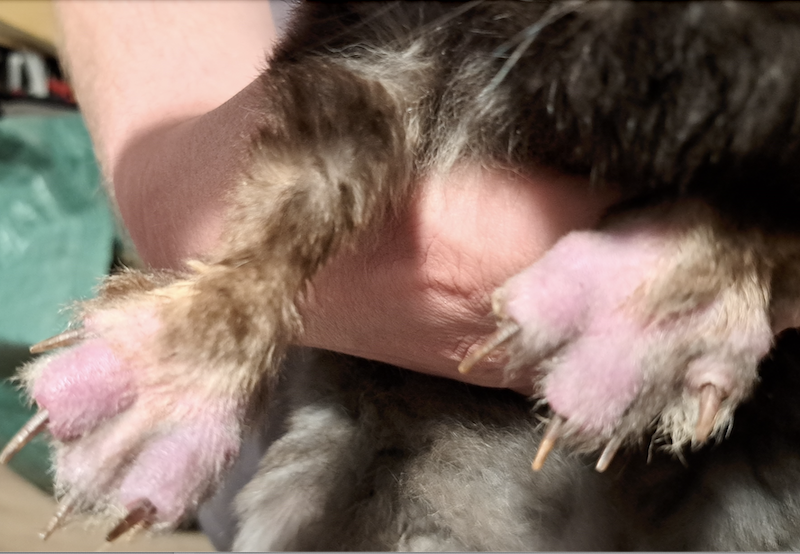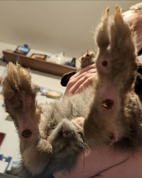 Sechs Wochen nach Aufnahme waren auch die hinteren Pfoten bis auf den kaudalsten Teil des linken Calcaneus mit dichtem Fell bewachsen. Die alopezischen Stellen an den Unterschenkeln blieben. Die Wunde am Calcaneus war weiterhin verkrustet. Aufgrund von Scheuerstellen an der Beugeseite des Sprunggelenks, die sich auch mit veränderter Wickeltechnik oder ersatzweise einem dicken, schmalen Socken nicht verhindern ließen, wurde das Gelenk nicht mehr verbunden. Zu den Schaumstoffpolstern gesellte sich ein Kaninchenklo mit Sägespänen, was gut angenommen wurde.