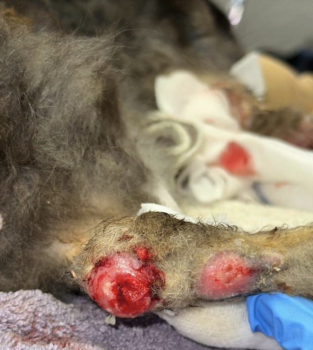 Gut zwei Wochen nach Behandlungsbeginn wurde ein chirurgisches Wunddebridement unter Allgemeinanästhesie (0,5mg/kg Midazolam, 0,2mg/kg Medetomidin, 5mg/kg Ketamin) durchgeführt. Wie angenommen, standen beide vorderen Ballen und die meisten vorderen Zehen komplett unter Eiter, der auch die hochgradige Schwellung der Zehen verursacht hatte. Nach vorsichtiger Entfernung des Eiters wurden die Wunden abermals gespült und verbunden. Am linken Calcaneus wurde nach Entfernung der hartnäckigen Eiterschichten, die bis dahin die Wunde bedeckten, ein tiefes Geschwür freigelegt, durch das sich der Calcaneus sondieren ließ. Hier zeigte sich im Röntgenbild eine diffuse Aufhellung am proximalen Calcaneus.