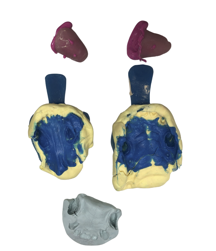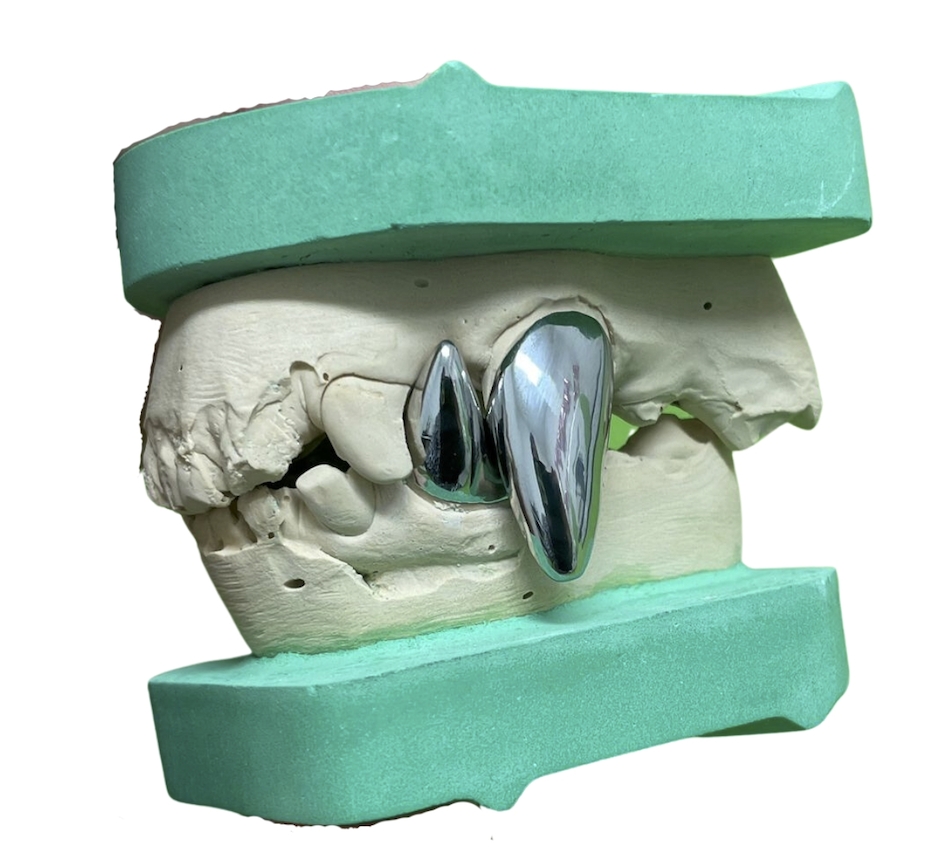 Im Dentallabor wurden die Abdrücke mit Gips ausgegossen und auf den entstandenen Gipsmodellen dann die Zahnkronen in Wachs modelliert. Bereits in Wachs wird die Kontaktsituation zum Gegenkiefer geprüft und ggf. angepasst. Die Wachskronen werden anschließend in Metall gegossen, ausgearbeitet und poliert.