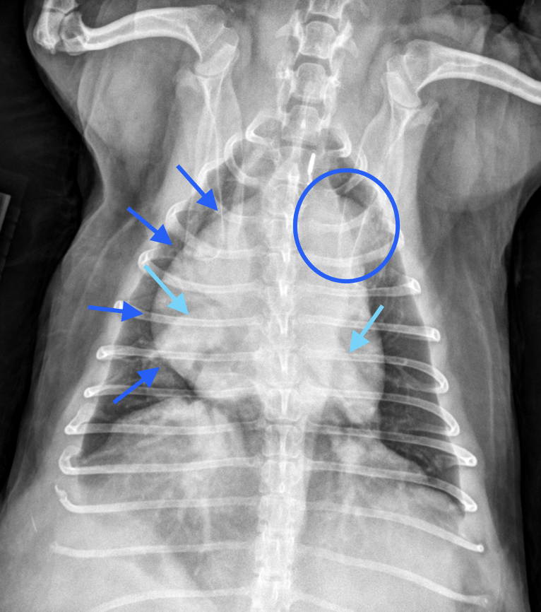Dr. Anna Adrian, MS, DACVR, antwortet: Vielen Dank für die Zusendung dieses interessanten Falles. Es liegen eine links- und rechtslaterale sowie eine ventrodorsale Thoraxaufnahme vor. In allen drei Projektionen zeigt sich eine ausgeprägte rechtsseitige Kardiomegalie, die mit einer dorsalen Verlagerung der Trachea sowie einem vermehrten Kontakt des Herzens zum Sternum einhergeht (Bild 1, dunkelblaue Pfeilköpfe). In der ventrodorsalen Projektion imponiert die Rechtsherzvergrößerung als typische „reverse D-Form“ (Bild 2, dunkelblaue Pfeile). Zusätzlich fällt in dieser Ansicht auf Höhe der 2-Uhr-Position eine Vorwölbung auf, die einer Dilatation des Truncus pulmonalis entspricht (Bild 2, dunkelblauer Kreis).