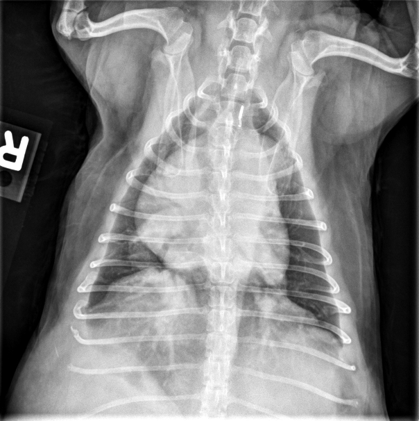 Zusammenfassend liegen eine ausgeprägte rechtsseitige Kardiomegalie sowie eine deutliche Erweiterung der Pulmonalarterien vor. Die Befundkonstellation spricht für eine pulmonale Hypertension in Kombination mit einer Kardiomyopathie, möglicherweise sekundär infolge einer Herzwurmerkrankung oder eines idiopathischen Cor pulmonale. Zur weiterführenden Abklärung wird eine echokardiographische Untersuchung empfohlen. Das bronchointerstitielle Lungenmuster kann altersphysiologisch bedingt sein, differentialdiagnostisch sind jedoch auch eosinophile Infiltrate im Rahmen einer parasitär bedingten Hypersensitivitätsreaktion in Betracht zu ziehen. Die Dilatation der Vena cava caudalis kann einerseits ein Normvariant darstellen, andererseits im Kontext der Rechtsherzvergrößerung auf eine Rechtsherzinsuffizienz oder ein Vena-cava-Syndrom bei hoher parasitärer Last hinweisen.
