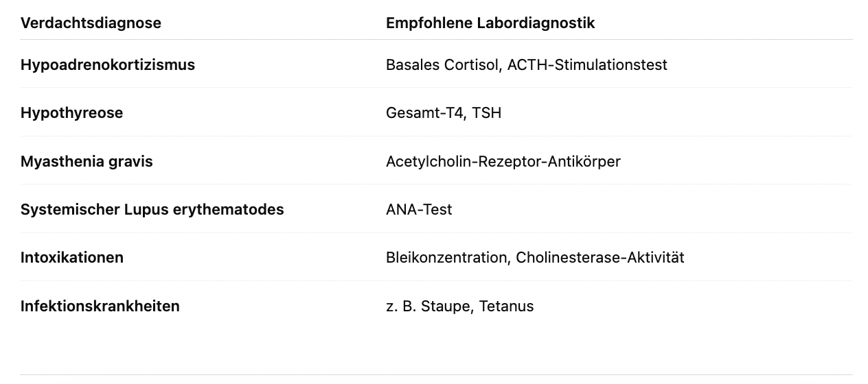 Labordiagnostische Untersuchungen: Neben einer Routinelaboruntersuchung empfiehlt es sich in der Dysphagiediagnostik, standardmäßig die Kreatinkinase (CK) zu bestimmen. Weitere Labortests sollten abhängig von der jeweiligen Verdachtsdiagnose ergänzt werden (Tabelle 2).