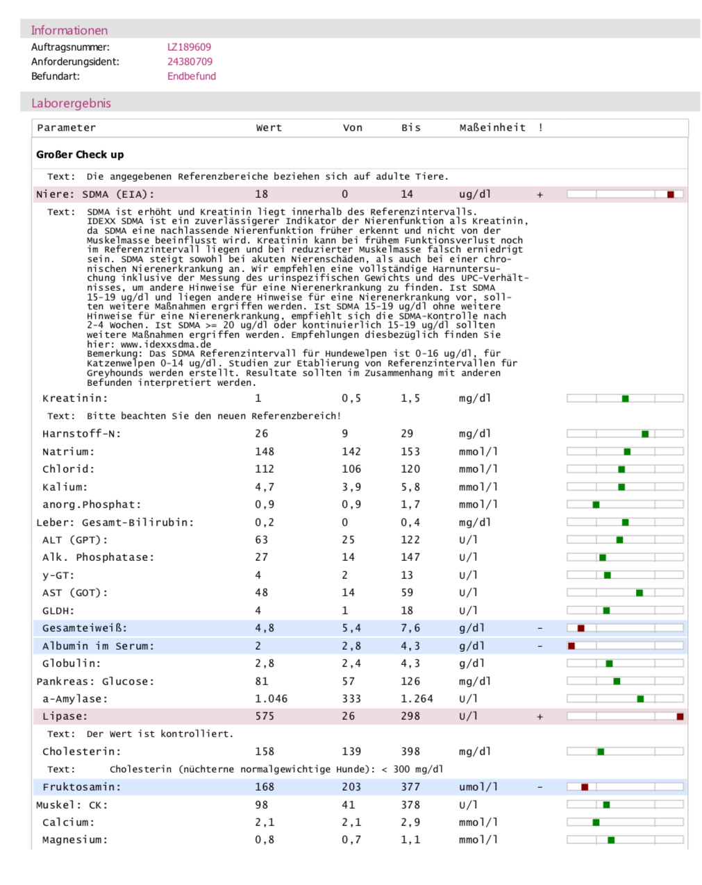 Weiterführende Untersuchungen mit Labor und bildgebender Diagnostik standen nun auf dem Plan. In der Blutuntersuchung wurden reduzierte Bluteiweißwerte, erhöhte Bauchspeicheldrüsenwerte sowie ein erhöhter Folsäurespiegel festgestellt. In der Ultraschalluntersuchung fanden sich ebenfalls Hinweise auf einen Entzündungsprozess im Darm. Die Darmlymphknoten waren auffällig vergrößert, und sowohl die Magen- und Darmschleimhaut waren verdickt. Hier fanden sich somit die ersten Hinweise, dass Plutos Darm nicht mehr richtig funktionierte.