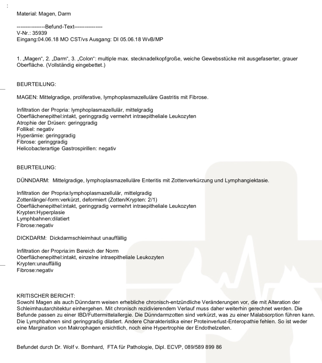 Zur Verbesserung seines Zustandes beschlossen wir, mit der Besitzerin dann jedoch eine medikamentöse Therapie zu starten. Bevor wir damit begannen, wurde eine Endoskopie des Magens und des Darms bei Pluto durchgeführt. Dies war notwendig, um den Schweregrad festzustellen und die Therapie auf Pluto genau abzustimmen. Bei einer Endoskopie werden kleine Gewebeproben, sogenannte Biopsien, aus dem Magen und Darm entnommen. Diese Gewebeproben gelangen zur weiteren histologischen Untersuchung in ein Speziallabor.