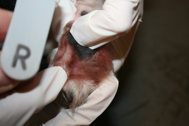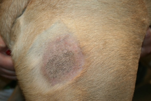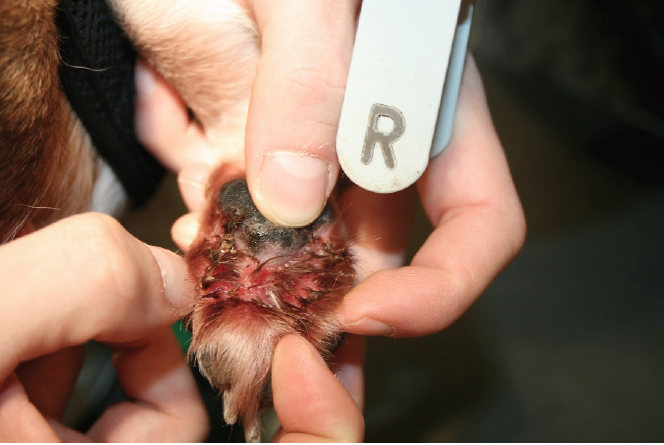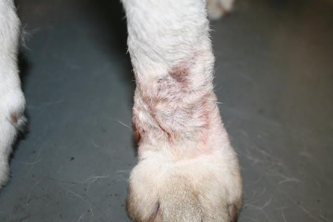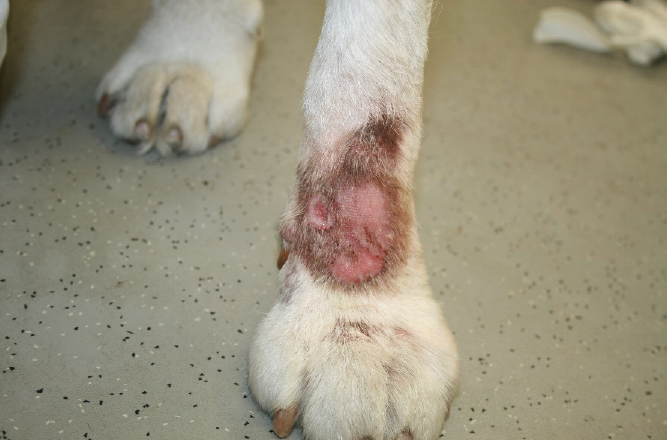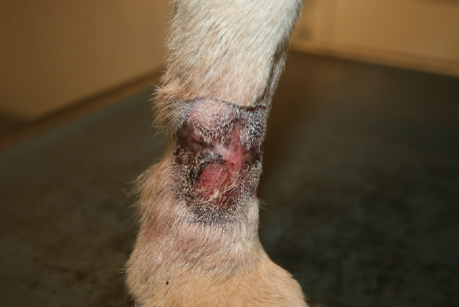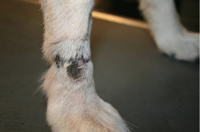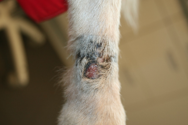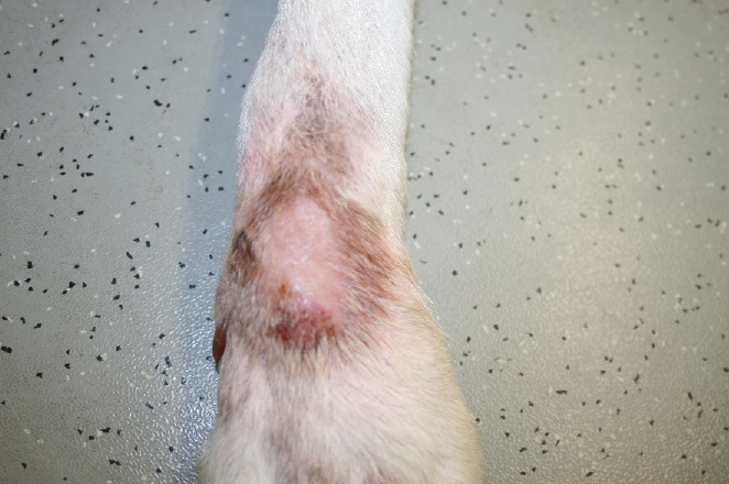Balu, neun Jahre, männlich kastriert, seit über einem Jahrunbefriedigender Verlauf einer akralen Leckdermatitis. Seit über einem Jahr beleckte Balu bei jeder Gelegenheit seinen rechten Vorderlauf, weshalb er dauerhaft einen Halskragen tragen musste. Trotz vorausgegangener adäquater Therapieheilte die Haut nicht ab. Nach Absprache mit dem Besitzer begannen wir die Fluoreszenzbiomodulation mit zwei wöchentlichen Bestrahlungen. Nach fünf Wochen ist dieakrale Leckdermatitis vollständig abgeheilt. Parallel verordnete ich ein Antibiotikum. Obwohl die Wunde abgeheilt ist und Balu keine Beschwerden mehr hat, trägt er vorsichtshalber nocheinen Halskragen, wenn er unbeaufsichtigt ist, da er durch die lang anhaltenden Beschwerden gewohnheitsmäßig leckte.