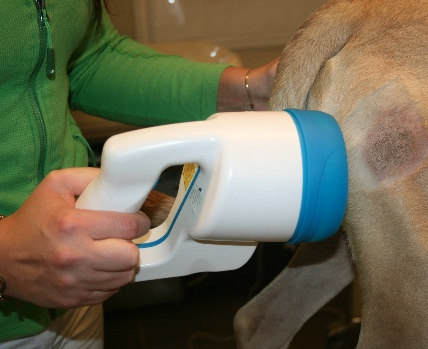 Bei der Fluoreszenzbiomodulation handelt es sich um eine innovative Technologie in der Tiermedizin. Zunächst wird eine ca. zwei mm dicke Gelschicht auf das betroffene Hautareal aufgetragen. Dieses Areal wird mit einer Lampe bestrahlt, die Blaulicht aussendet. Das Gel enthält Moleküle, die Licht absorbieren und dann wieder Licht mit größeren Wellenlängen abgeben, die tiefere Hautschichten erreichen können. In dem bestrahlten Gewebe werden durch das weitergeleitete Licht drei Prozesse angeregt: