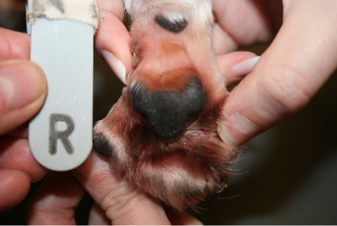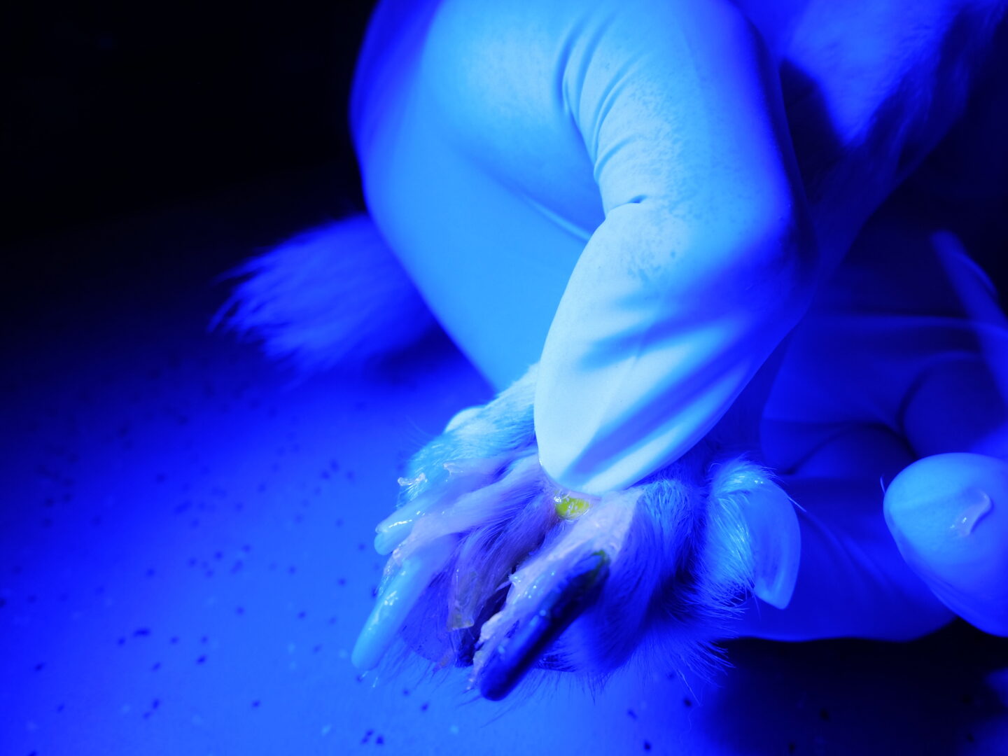 Porthos, elf Jahre, männlich kastriert, alle vier Pfoten von tiefen Entzündungen betroffen. Porthos litt seit etwa sechs Jahren an einer tiefen, schmerzhaften, sog. ulcerativen Hautentzündung an allen vier Pfoten. Keine der im Laufe der Jahre durchgeführten Therapien führte zu einer Heilung, der Hund hatte zu diesem Zeitpunkt keinerlei Lebensqualität mehr. Jeder Schritt war schmerzhaft für Porthos, an Spaziergänge war nicht mehr zu denken. Der Besitzer fragte sich, ob weitere Behandlungen noch Sinn machten. Wir besprachen mit ihm die Fluoreszenzbiomodulation als neue Therapieoption - und er wollte diese Chance noch wahrnehmen. Wir bestrahlten zweimal wöchentlich alle Pfoten über insgesamt acht Wochen. Begleitend dazu wurde Porthos von uns antibiotisch behandelt. Von Woche zu Woche besserte sich sein Zustand. Nach acht Wochen waren Porthos Pfoten abgeheilt.