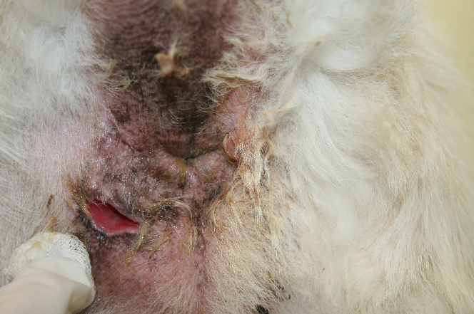 Hektor, elf Jahre, männlich kastriert, leidet trotz Behandlung seit zwei Jahren an einer schmerzhaften Perianalfistel, als er uns vorgestellt wird. Hektor