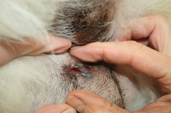 hatte Schmerzen beim Kotabsatz und leckt immer wieder an seinem After.
