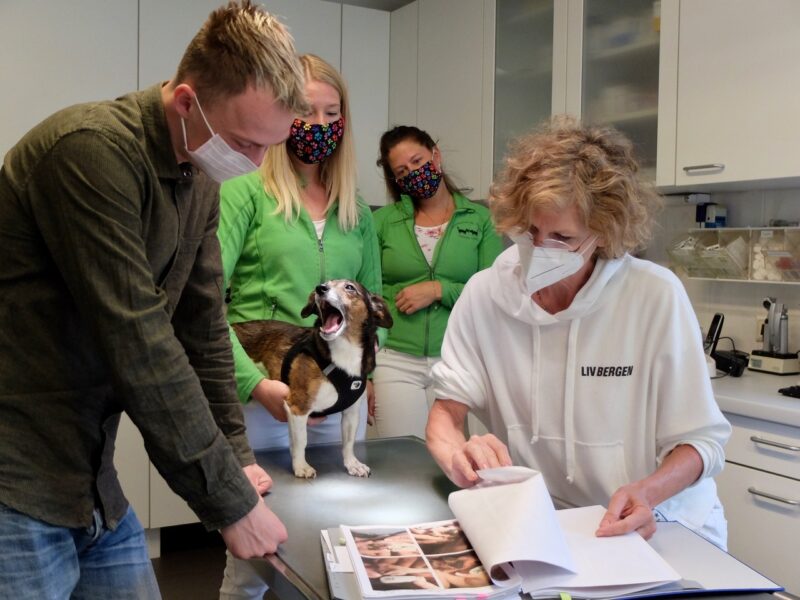 Nuna, elf Jahr, weiblich, kastriert, wurde wegen einer Umfangsvermehrung am Hinterbein operiert. Seit sechs Monaten verheilte die Wunde trotz Verbänden und diverserer Behandlungen nicht. Als Nuna uns vorgestellt wurde war ihr rechter Hinterlauf akut entzündet. Die konventionellen Therapiemethoden waren zuvor bereits ausgeschöpft. Nuna konnte nicht ohne Halskragen und Verband sein. Nach eingehender Untersuchung besprachen wir mit der Besitzerin die Therapieoptionen und entschieden uns für die Fluoreszenzbiomodulation. Parallel zur Bestrahlung stellten wir Nuna unter eine Antibiose. Nach Abschluss der Behandlung bekommt Nuna nur noch in für sie besonders stressreichen Situationen (Autofahren) vorsichtshalber einen Leckschutz.