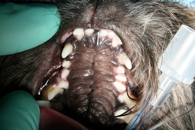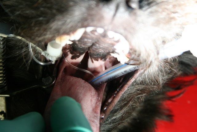 Am Tag der weiterführenden Untersuchung wurde „Prinzessin“ nach einer unauffälligen präanästhetischen Untersuchung in Allgemeinnarkose versetzt und in Narkose die Maulhöhle vollständig untersucht. Die Narkoseeinleitung erfolgte nach Prämedikation (Medetomidin und Butorphanol) mit Propofol bis zum Eintritt des Bewusstslosigkeit und wurde nach Intubation auf eine Inhalationsnarkose mit druckkontrollierter Beatmung mit einem Luft-Sauerstoff-Isofluran-Gemisch umgestellt. Zur Narkoseüberwachung wurden EKG, nichtinvasive Blutdruckmessung, Pulsoxymetrie, Kapnometrie und Thermometrie durchgeführt. Während der Narkose erhielt „Prinzessin“ Ringer-Lösung als Dauertropfinfusion über einen venösen Zugang. Als Analgetikum wurde präoperativ Metamiziol verabreicht. Nach der Eingangsuntersuchung der Maulhöhle mit Dokumentation von Zahnstein und Gingivitisindex erfolgte nach einer professionellen Zahnreinigung und Desinfektion die Sondierung aller Zähne. Hier konnten an einigen Zähnen Gingivitis Grad 1-2 erhoben werden, aber noch ohne wesentliche Beteiligung des Zahnhalteapparats. Die eingehende Untersuchung des harten Gaumens zeigte eine durchgängige Gaumenspalte von der Papilla Incisivi bis zum Gaumensegel. Dies führte dazu, dass einerseits immer wieder Futter und Trinkwasser von der Maulhöhle in die Nasenhöhle gelangen konnte und infolge aspiriert wurde. Darüber hinaus war auch der Abschluckvorgang durch das unvollständig ausgebildete Gaumensegel gestört.