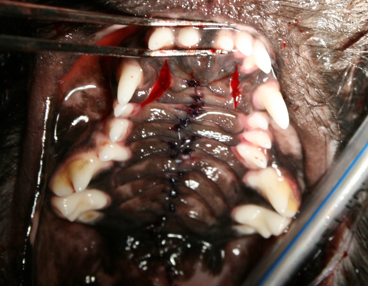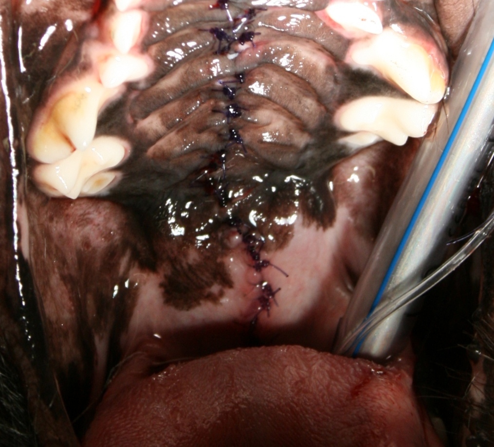 Nach Besprechung der Befunde mit der Besitzerin wurde die Gaumenspalte operativ in der gleichen Narkosesitzung verschlossen. Zuerst wurde die Gaumen-Schleimhaut im Bereich der Gaumenspalte sorgfältig abpräpariert, damit keine Epithelreste eine Wundheilung verhindern können. Bei der Blutstillung wurde auf HF-chirurgische Instrumente verzichtet, um die Blutgefäßversorgung und –integrität nicht negativ zu Beeinflussen. Nachdem die knöchernen Defekte im mittleren Bereich der Gaumenspalte nur sehr dezent waren und genug Schleimhaut zur Verfügung stand konnte auf Maßnahmen zur Mobilisierung weiterer Schleimhaut verzichtet werden. Im rostralen Bereich caudal der Papilla Incisivi mussten Entlastungsschnitte nahe des Margo alveolaris angelegt werden. Dies war notwendig, um die Gingiva des harten Gaumens zu mobilisieren und um einen spannungsfreien Wundverschluss gewährleisten zu können. Im Bereich des weichen Gaumens wurden Inzisionen angelegt und das Gaumensegel neu konstruiert. Die Naht erfolgte jeweils zweischichtig Stoß auf Stoß mit Monoplus 4/0 in Form von Einzelheften.