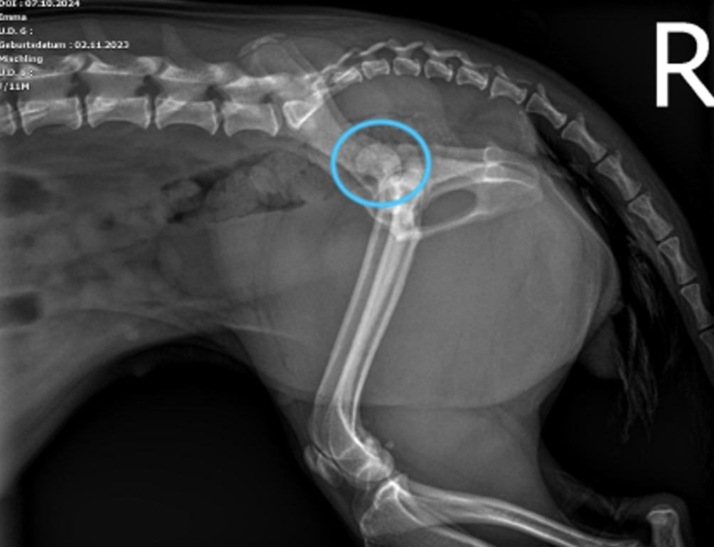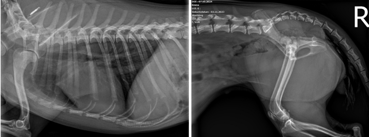 Anbei die Röntgenbilder der Hündin Gina. Gina ist eine weiblich kastrierte 1-jährige Mischlingshündin und wurde bei uns aufgrund einer Lahmheit nach Trauma vorstellig. Welche Pathologien erkennen Sie und welches weitere Vorgehen empfehlen Sie?