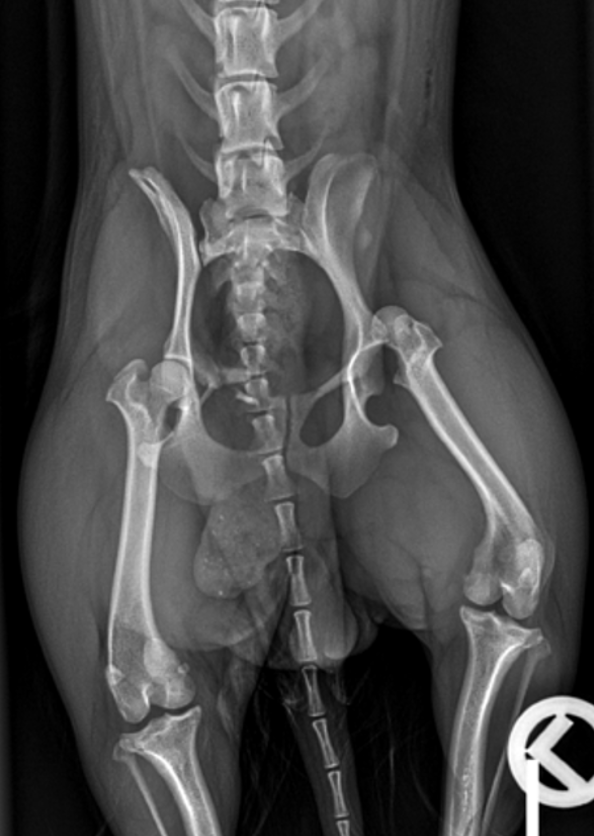 Der rechte Femurkopf ist vollständig aus dem Acetabulum luxiert und nach kranial und dorsal verschoben (blaue Kreise). Die Weichteile des linken Femurs sind geringgradig verdickt. Im linken lateralen Aspekt der abdominalen Wand ist eine minimale Luftansammlung erkennbar. Beidseits sind die Coxofemoralgelenke geringgradig nach außen rotiert, welches eine laterale Positionierung der Patellae verursacht. Im rechten Kniegelenk befindet sich die Patella jedoch in medialer Position (blauer Pfeilkopf). Es ist unklar, ob ob diese traumatisch oder rasse-bedingt entstanden ist und welcher Grad der Patellaluxation vorliegt. Die sichtbaren caudalen abdominalen Organe sind ohne besonderen Befund.