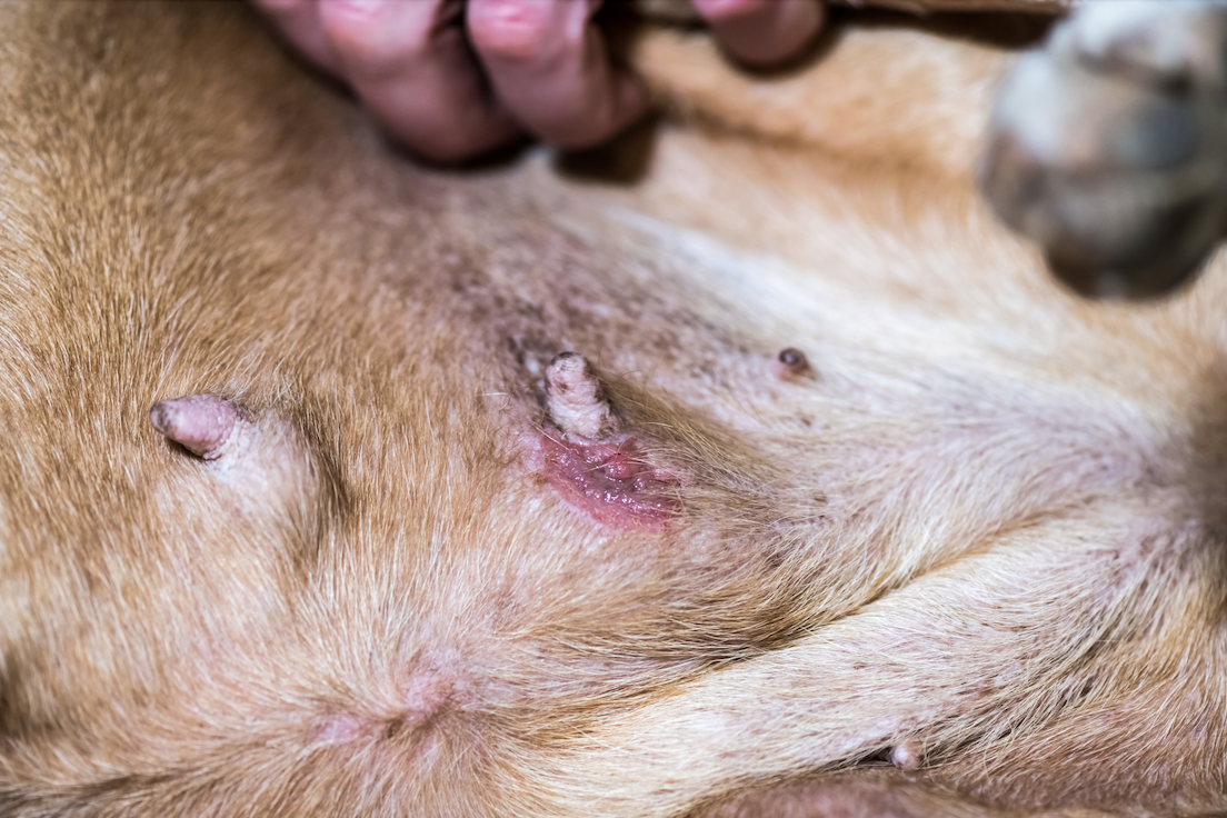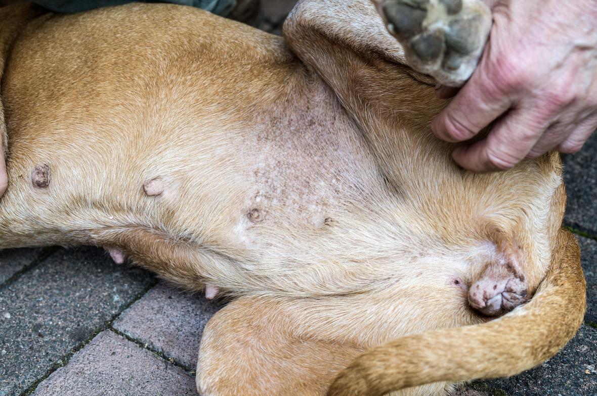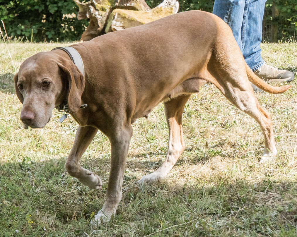 Schon seit Jahren wachsen im Gesäuge der Vizsla-Hündin diverse Tumore (Bild 1/März 2020). Im März 2021 verschlechtert sich das Allgemeinbefinden der mittlerweile 14jährigen Hündin. Der Tumor im caudalen Gesäugekomplex hat die Größe einer Orange erreicht, ist hart und höckerig. Die Hündin liegt viel und leckt sich im Bereich des Tumors. Eines Abends findet der Tierbesitzer seine Hündin auf ihrem blutverschmierten Lager. Sie hat den Tumor abgefressen! (Bild 2 /3.2021).