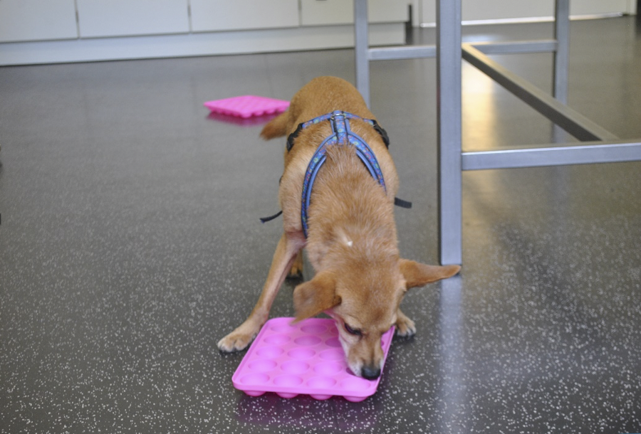 Um einen bleibenden positiven Eindruck zu hinterlassen, sollte hochwertiges Futter großzügig während des gesamten Besuchs verwendet werden (z.B. Durchfüttern während Untersuchungen oder kleineren Prozeduren). Ein einziges Leckerli am Ende eines 15-minütigen Besuchs wird kaum ausreichen, um den ganzen Aufenthalt positiv in Erinnerung zu behalten. Die verwendete Belohnung muss wirklich hochwertig sein, um potenziell angstbelegte Situationen positiv zu verknüpfen. Oft können Hunde unter Stress eher Dinge zum Lecken annehmen als festes Futter. Bewährt haben sich unter anderem Nassfutter oder Streichkäse. Diese Leckereien können in Lickimats angeboten werden (um die Zeit des Konsums zu verlängern), aus denen sich die Hunde selbst bedienen können, oder mittels Futterkruken oder Spateln dargereicht werden. Besonders hochwertig sind auch Pasteten oder Leberwurst sowie Wurst, Käse oder Trockenfleisch. Die Halter können ermuntert werden, die liebsten Leckereien ihres Hundes mitzubringen.