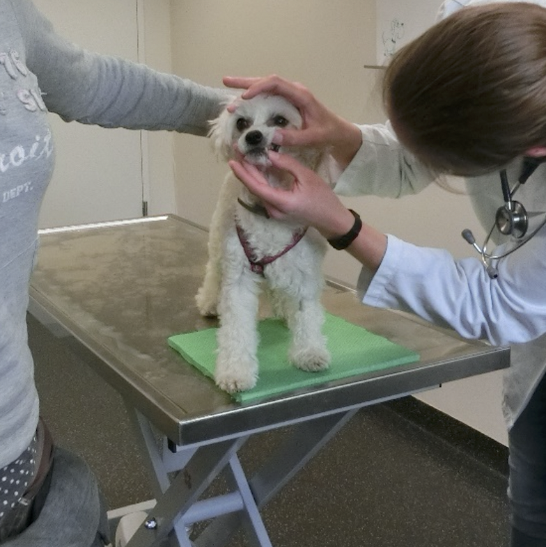Die Untersuchung und Behandlung sollte dort stattfinden, wo sich das Tier am wohlsten fühlt. Viele Hunde bleiben am Boden entspannter als auf dem Tisch. Rutschige, harte und kalte Oberflächen können Unbehagen auslösen; Abhilfe schaffen Handtücher, Decken, rutschfeste Matten oder weiche Auflagen. Die Besitzer können außerdem dazu ermutigt werden, eigene Decken oder Handtücher als Unterlage mitzubringen, da diese durch den vertrauten Geruch zusätzlich zum Wohlbefinden beitragen können. Generell ist ein respektvoller und sanfter Umgang mit dem Tier essenziell! Sogenanntes „Low-Stress-Handling“ reduziert die Belastung auf das unumgehbare Minimum. Das Ziel ist, dass sich das Verhalten des Tieres von Besuch zu Besuch verbessert. Damit können Untersuchung auf lange Sicht rascher und stressfreier für alle Beteiligten durchgeführt werden. Dies kann vor allem durch das Herstellen von positiven Assoziationen mit dem Tierarztpraxisbesuch erreicht werden. Eines der besten Mittel dafür ist Futter.