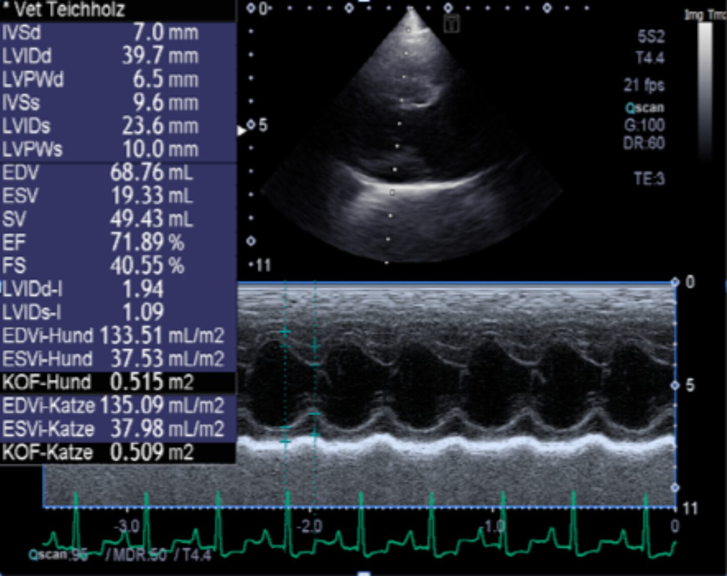 Ultraschall: in der rechtsanliegenden Längsachse sind die linke Kammer und der linke Vorhof vergrößert; die rechten Kammern stellen sich unauffällig dar. Die Mitralklappe ist deutlich degenerativ verändert und prolabiert in den linken Vorhof. Die Maße des linken Ventrikels liegen in der Teichholzuntersuchung diastolisch oberhalb der Norm. LA/Ao liegt im M Mode und im B Bild oberhalb der Norm. In der Farbdoppler-sonographischen Untersuchung stellen sich Turbulenzen über der Mitral- und Trikuspidalklappe dar, die restlichen Flussmuster sind unauffällig Die systolische Funktion des linken Ventrikels ist gesteigert, die diastolische Funktion ist deutlich reduziert, die gemessenen Flussgeschwindigkeiten liegen sämtlich in der Norm. Die Rückflussgeschwindigkeit über der Mitralklappe liegt bei 5,8 m/s, der Rückfluss über der Trikuspidalklappe wird bei 3,0 m/s gemessen.