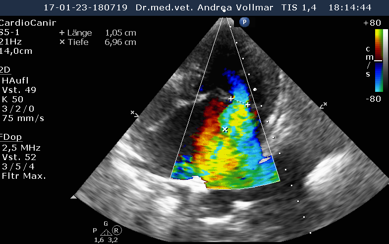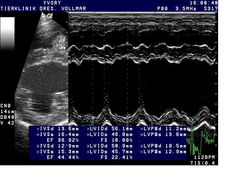 Am sichersten kann die Größe der einzelnen Herzabteilungen und der Schweregrad einer AV-Klappeninsuffizienz mit Hilfe der Echokardiografie beurteilt werden. Die Messung der Vorhofgröße vorzugsweise im 2D-Bild korreliert zuverlässig mit dem Ausmaß der MI. Mittels verschiedener Doppler- und Farbdoppler-Analysemethoden kann die Größe der Lücke in der Mitralklappe bestimmt und das regurgitierte Blutvolumen ermittelt werden.