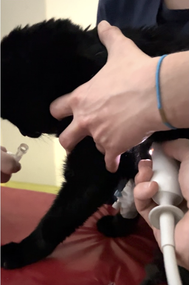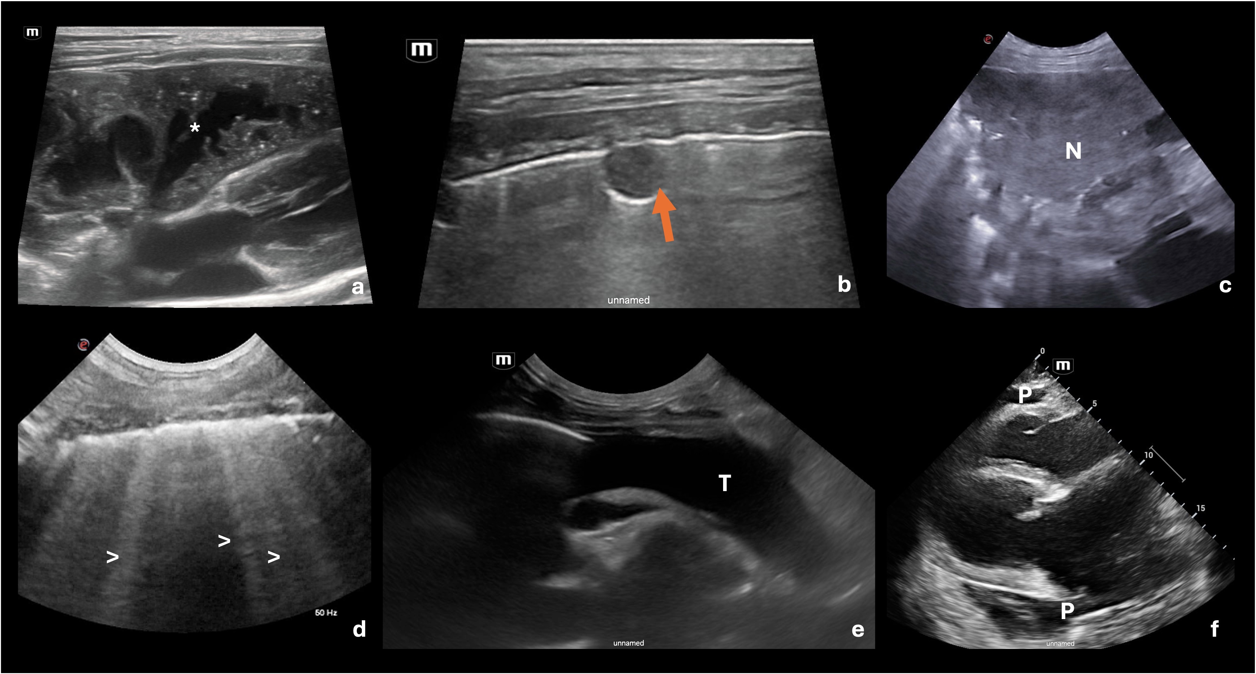Der thorakale Point-of-Care-Ultraschall, insbesondere im Rahmen des TFAST-Protokolls, ist ein etabliertes Instrument in der Notfall- und Intensivmedizin. Ziel ist nicht die vollständige Parenchymdiagnostik, sondern die rasche Beantwortung lebensentscheidender Fragen. Das Vorgehen ist prinzipiell auf Hund und Katze übertragbar - Abb. 3 zeigt die Durchführung bei einer Katze. In Abb. 4 werden verschiedene thorakale Ultraschallbefunde präsentiert. Neben dem TFAST hat der Ultraschall für die Probengewinnung eine große Bedeutung – ettliche pulmonale Läsionen lassen sich sonographisch darstellen und dann gezielt punktieren.