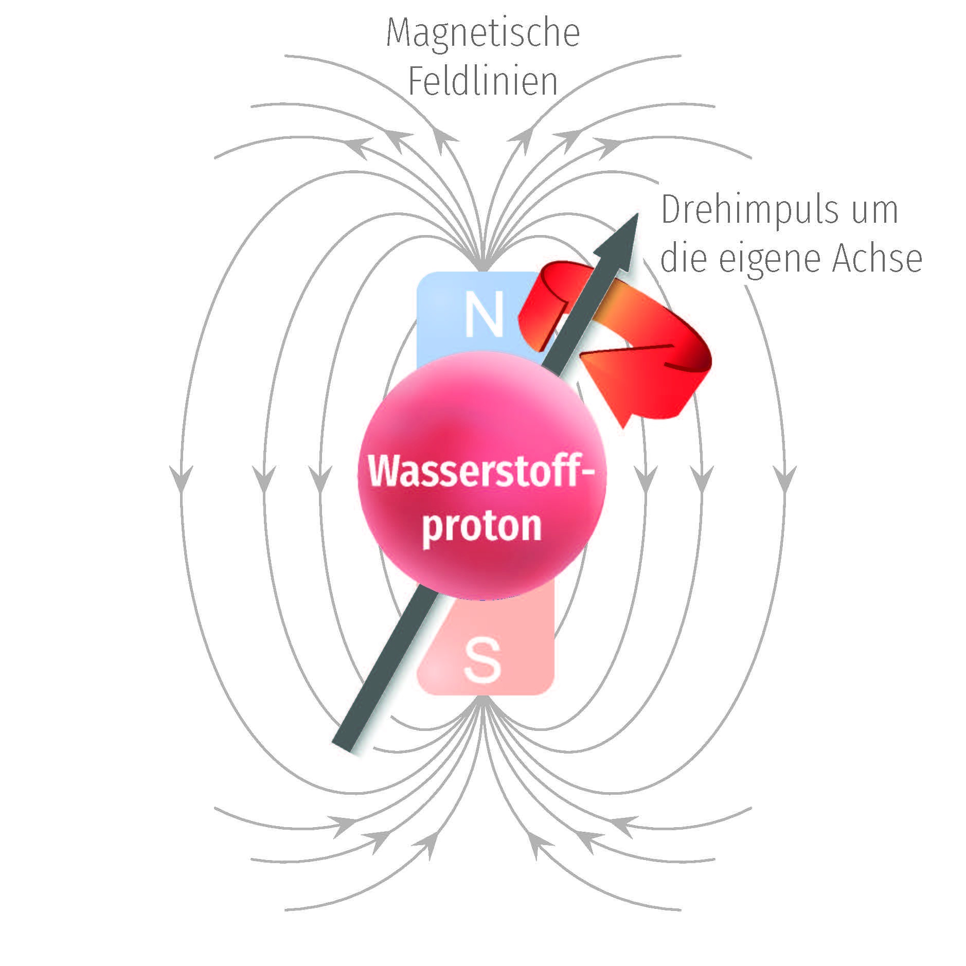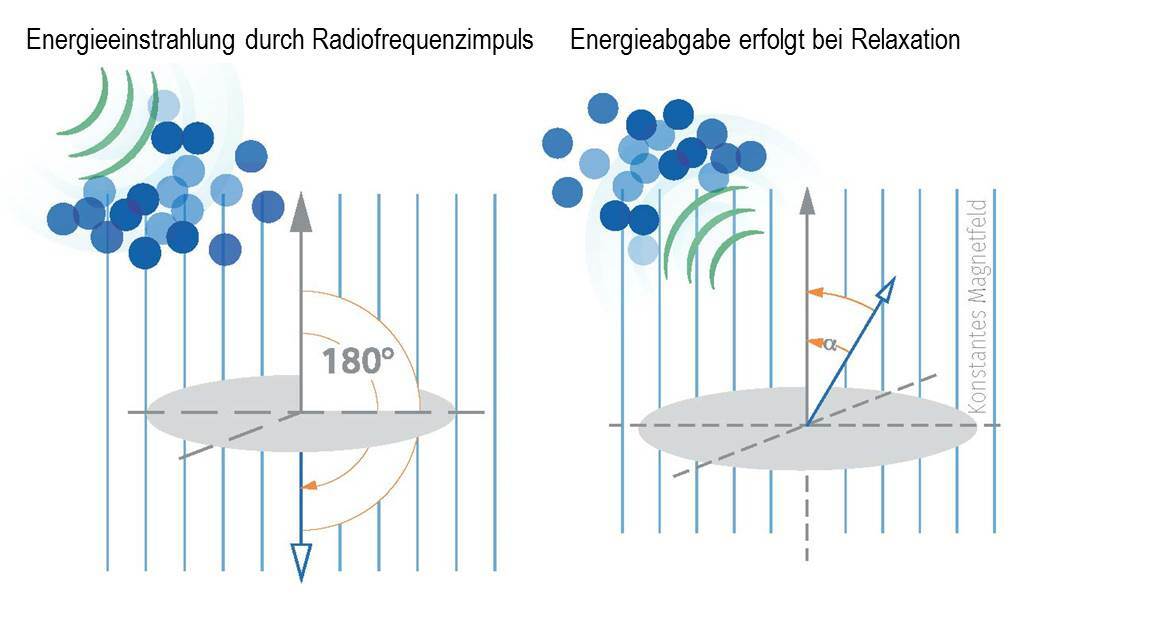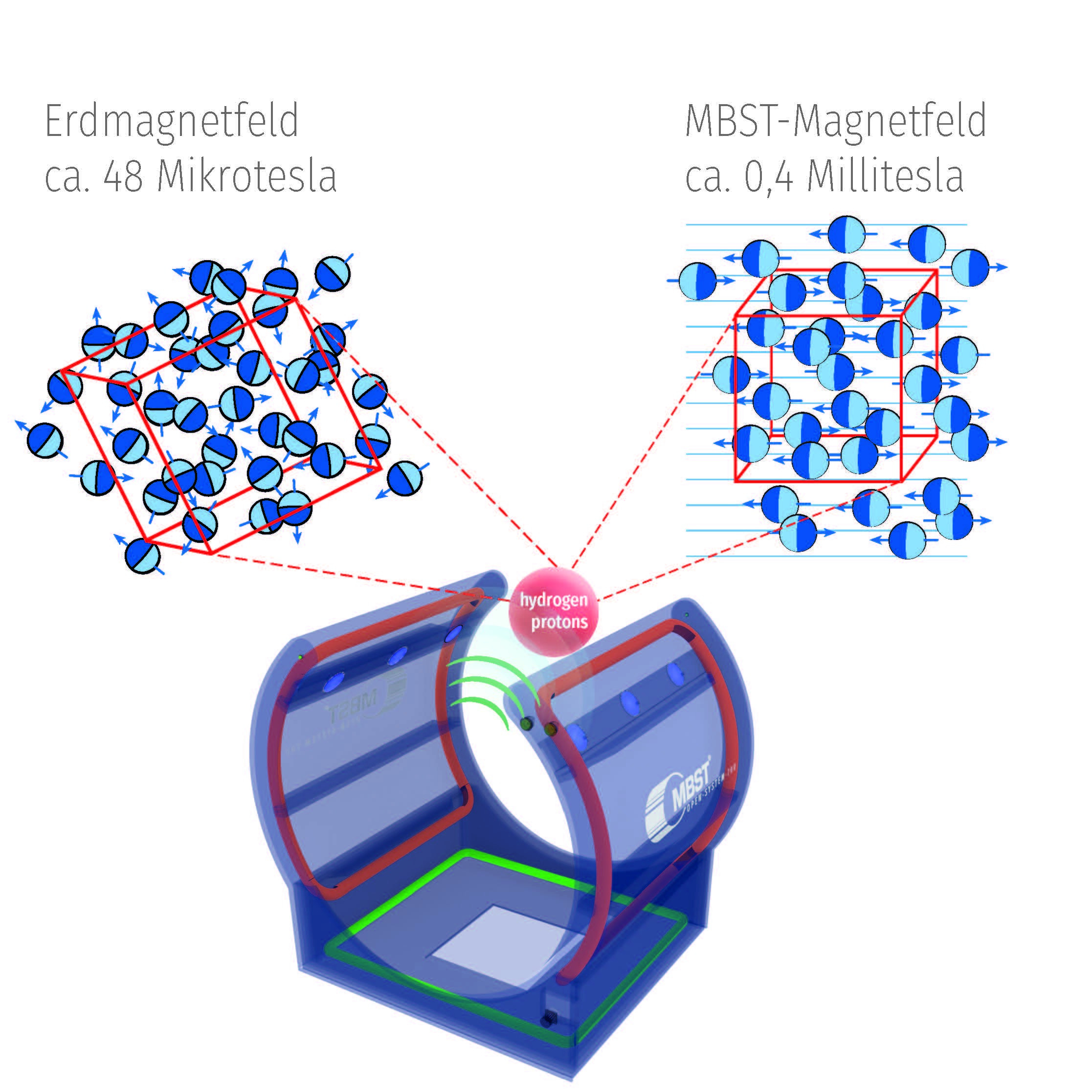 Die Molekulare Biophysikalische Stimulation (MBST®) basiert auf dem physikalischen Prinzip der Kernspintomographie mit schwächeren Feldern und niedrigeren Frequenzen als in der bildgebenden Diagnostik. Im Mittelpunkt stehen hierbei Wasserstoffatome (Abb. 1), deren Kernspin normalerweise – also unter dem Einfluss des Erdmagnetfeldes – ungeordnet sind. Sie können aber von stärkeren Magneten beeinflusst werden, und die Protonen richten sich entlang der Feldlinien aus (Abb.2). Wird jetzt ein Radiofrequenzimpuls angelegt werden die Kernspins aus dem Gleichgewicht gebracht und kippen, je nach Dauer und Intensität des Impulses, um bis zu 180°. Nach Abschalten des Radiofrequenzimpulses streben die Protonen, bedingt durch das konstante Magnetfeld, unter Energieabgabe in ihre Ausgangsverteilung zurück (Abb. 3). Diese ausgesandten Wellen können mit Detektorspulen aufgefangen werden und geben u. a. Auskunft über Protonendichte und chemische Umgebung der Protonen in dem angeregten Gewebe – dies wird in der MRT zur Bildgebung genutzt.