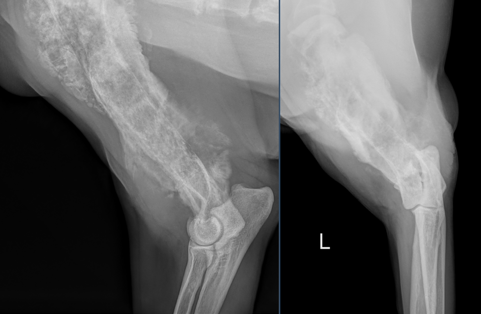Das Vorhandensein eines einzigen dieser Kriterien reicht aus, um eine Läsion radiologisch als aggressiv einzustufen. Unter den primären Knochentumoren des Hundes ist das Osteosarkom die mit Abstand am häufigsten auftretende Form. Typischerweise handelt es sich um eine monoostotische, aggressive Knochenläsion, die ihren Ursprung in der Metaphyse langer Röhrenknochen hat.