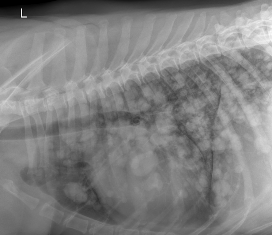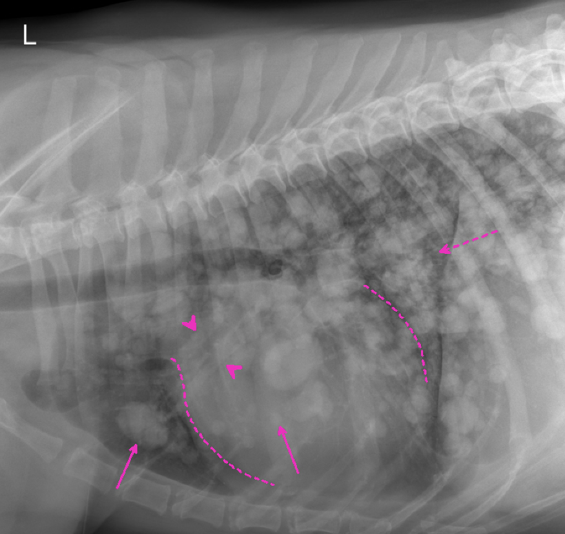Im Thoraxröntgen zeigen sich in allen Lungenlappen multifokale, noduläre Weichteilverschattungen unterschiedlicher Größe, wobei die größte eine Länge von 3,8cm und eine Breite von 2,6cm aufweist (exemplarisch pinke Pfeile). Generalisiert besteht zudem vor allem in den kaudalen Lungenlappen geringgradige (pink gestrichelter Pfeil), sowie im akzessorischen Lungenlappen moderate unstrukturierte Lungenzeichnung. Die Herzsilhouhette ist generalisiert globoid vergrößert (pink gestrichelte Linien). Die kranialen Lungengefäße wirken prominent, sind jedoch kleiner als die proximale Breite im Bereich der vierten Rippe (pinke Pfeilköpfe). Mediastinale Strukturen, Pleuralraum, Trachea, Ösophagus, sowie sichtbare ossäre Anteile stellen sich ohne besonderen Befund dar.