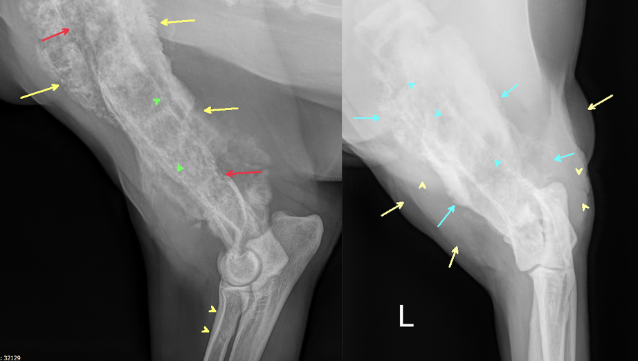 Vielen Dank für die Zusendung der Röntgenbilder. Ein wirklich eindrucksvoller Fall! Es liegen zwei Röntgenaufnahmen des linken Humerus, inkl. Ellbogengelenk, im medio-lateralen, sowie kaudo-kranialem Strahlengang vor. Begleitend besteht eine Röntgenaufnahme des Thorax in dextro-sinistralem Strahlengang (Abb. 1, Abb. 2). Im Röntgenbild der linken Vordergliedmaße zeigt sich im Bereich der gesamten Diaphyse des Humerus, bis in die angrenzenden metaphysären Abschnitte reichend, eine hochgradige, unregelmäßige osteoproliferative Reaktion (blaue Pfeile Abb. 3). Diese periostale Reaktion weist eine heterogene Röntgendichte auf. An ihrer ausgeprägtesten Stelle übersteigt die Proliferation den Durchmesser des normalen Humerus deutlich. Besonders an der kaudalen Humeruskontur besteht hochgradige, laminar geschichtete Knochenneubildung (gelbe Pfeile, Bild links).