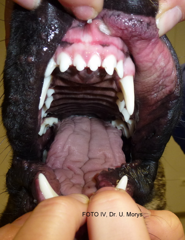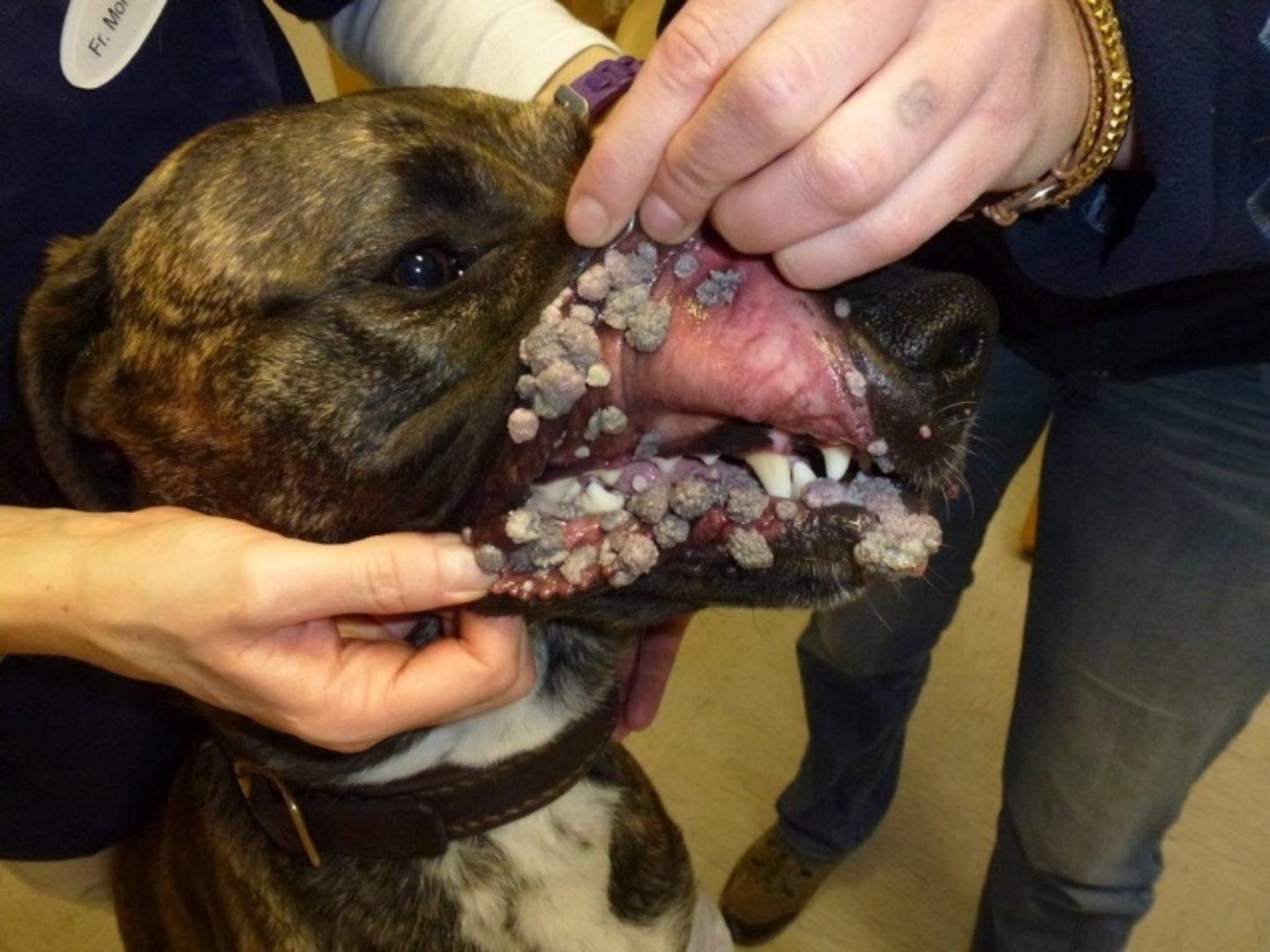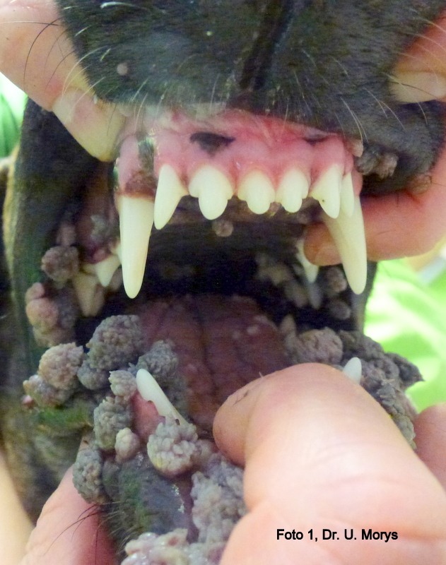 Am 3. April 2013 wurde in der Praxis ein Mischlingsrüde, geboren im Juni 2012, 36,5 Kilogramm schwer, wegen Zubildungen im Bereich der Lefzen und der Maulhöhle vorgestellt. Der Hund war kurz zuvor aus einer unsachgemäßen Tierhaltung beschlagnahmt worden. Am Tag der Vorstellung hatte der Hund massenhaft Warzen im Lefzenbereich, an der Backenschleimhaut, dem Zahnfleisch, auf der Zuge und am Gaumen. Der Kopfbereich wies einen extremen Verwesungsgeruch auf, ansonsten war der Hund munter, gut genährt, bisher einmal entwurmt und nicht geimpft. Es war nicht bekannt, wie lange die Zubildungen schon vorhanden waren.