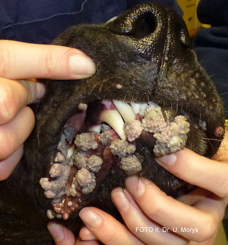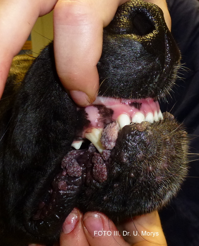 Die Lokalisation und die Art und Größe der Zubildungen sowie das Alter des Tieres sprachen für die Diagnose orale (Maulbereich) und kutane (kutis = Haut) Papillomatose. Die canine (canis = Hund) Papillomatose wird durch das Papillomavirus ausgelöst. Es verursacht bei jungen Hunden (ohne Rücksicht auf Rasse oder Geschlecht) gestielte, weißlich-gräuliche, warzenartige Zubildungen, die in der Regel nicht schmerzhaft sind und eine Größe von wenigen Millimetern bis zu drei Zentimetern Durchmesser haben können. Diese Neubildungen können einzeln, in kleinen Gruppen oder massenhaft auftreten.