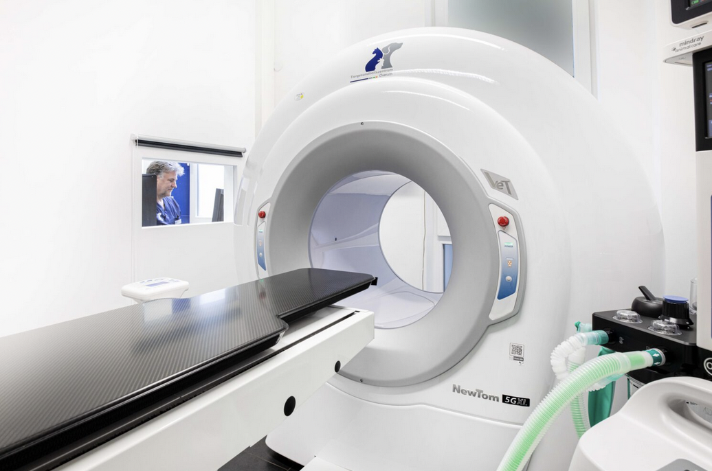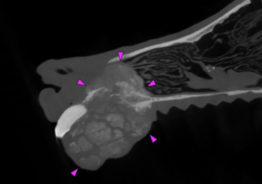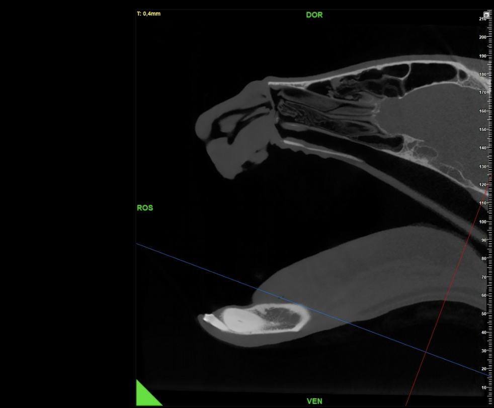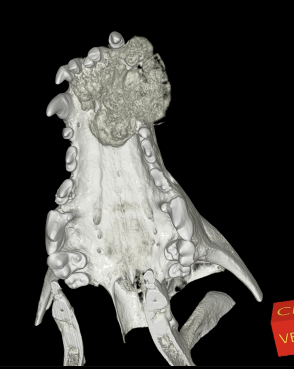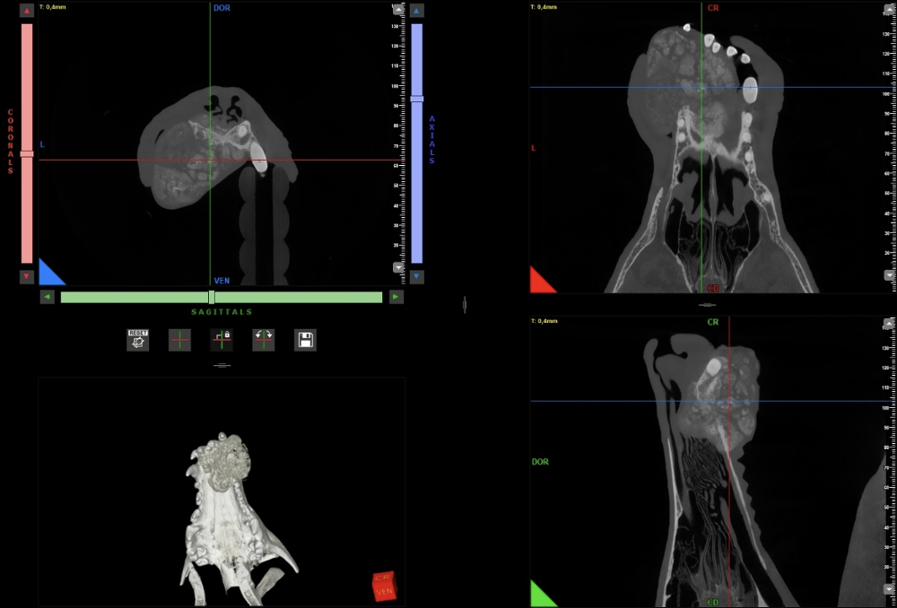 Wegen der klinisch sichtbaren Progression erfolgte die erneute Vorstellung zur weiterführenden Bildgebung. Die durchgeführte CBCT-Untersuchung zeigte eine große, heterogene, überwiegend osteoproduktive Masse des vorderen Oberkiefers. Der Tumor infiltrierte die linke Nasenhöhle, überschritt die Mittellinie und führte zu ausgeprägten knöchernen Destruktionen mit Verlagerung der Schneidezähne. Hinweise auf eine pulmonale Metastasierung ergaben sich in der Thoraxdiagnostik nicht. Das präoperative klinische Staging wurde als Stadium III (T3b, N0, M0) eingestuft. Trotz der ungünstigen Befundlage wurde nach ausführlicher Aufklärung der Besitzer eine operative Therapie angestrebt.