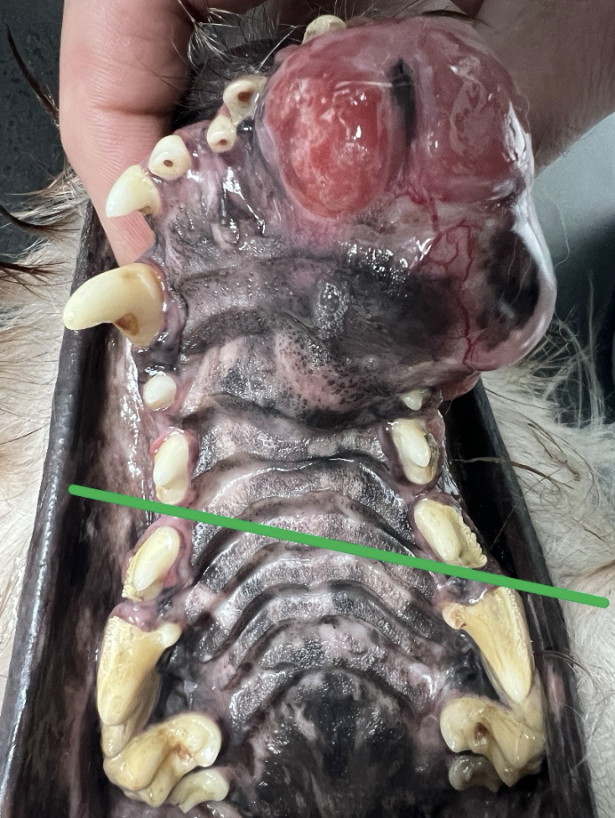 Die Therapie der Wahl beim oralen Osteosarkom ist die weiträumige chirurgische Resektion im gesunden Gewebe. Ziel war in diesem Fall eine möglichst radikale Tumorentfernung unter Erhalt von Nasenspiegel und Lefzen, um Funktion und Lebensqualität bestmöglich zu bewahren. Unter Allgemeinanästhesie und zusätzlicher beidseitiger infraorbitaler Leitungsanästhesie wurde eine unilaterale rostrale Maxillektomie durchgeführt. Die Resektion reichte rechts bis vor den P3 und links bis zum P4. Das Os incisivum sowie dorsale Anteile des Os nasale mussten vollständig entfernt werden. Die Resektionslinien wurden mit einem Sicherheitsabstand von etwa 1–2 cm im makroskopisch gesunden Gewebe festgelegt.