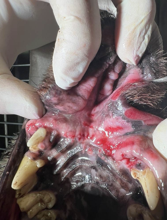Der kastrierte Mischlingsrüde „Ludwig“ (Körpergewicht ca. 35 kg) wurde im Juni 2024 im Alter von acht Jahren im TierZahnZentrum Overath vorgestellt. Seit etwa zwei Jahren bestand eine kontinuierlich zunehmende Umfangsvermehrung im linken rostralen Oberkiefer zwischen den Zähnen I1 und P2. Eine zuvor in der überweisenden Praxis entnommene Biopsie hatte histopathologisch ein maxilläres Osteosarkom ergeben. Aufgrund der damals als ungünstig eingeschätzten Prognose sowie der bereits fortgeschrittenen Ausdehnung war initial von einer chirurgischen Intervention abgesehen worden. Der Patient wurde stattdessen über einen Zeitraum von rund zwei Jahren mit Pamidronsäure behandelt. Unter dieser Therapie zeigten sich keine relevanten Blutbildveränderungen, das Tumorwachstum schritt jedoch weiter voran.