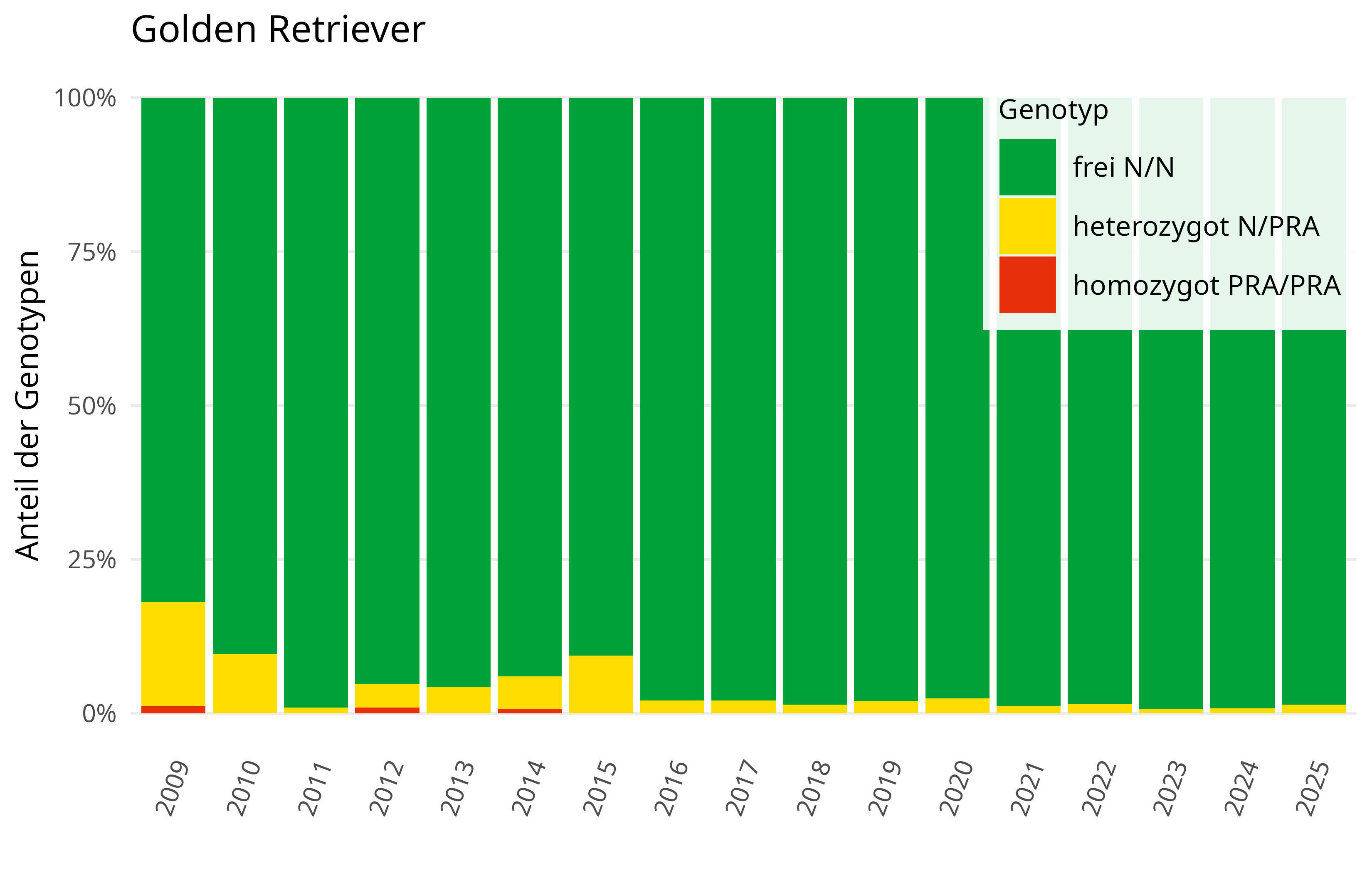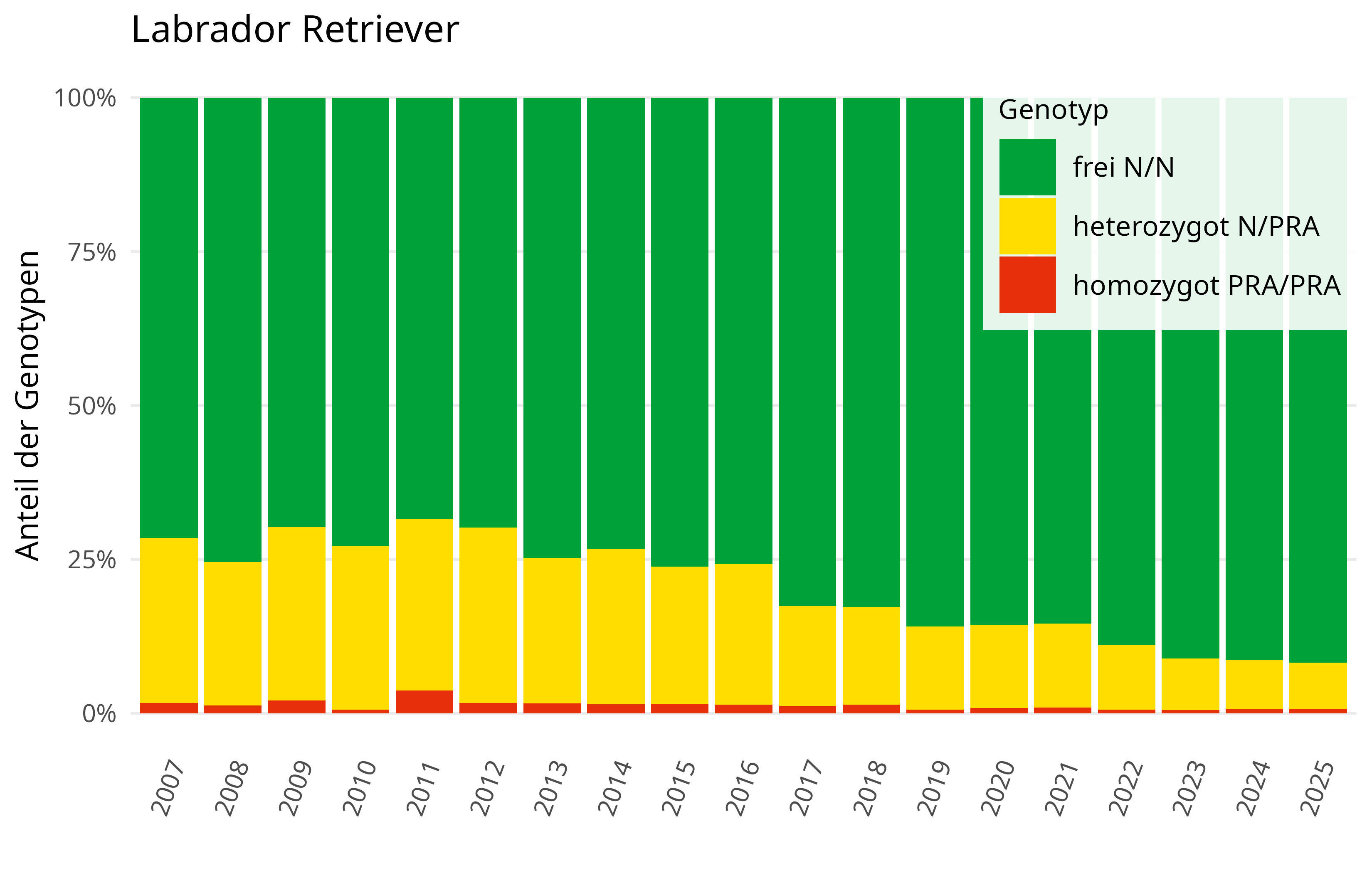 Der Labrador Retriever zählt seit vielen Jahren zu den beliebtesten Hunderassen weltweit. Die Beliebtheit spiegelt sich auch in den Probenzahlen der Tiere wider, für die die prcd-PRA Variante bei LABOKLIN untersucht wurde. Über 25.000 Tiere wurden seit 2007 analysiert, wobei die Ergebnisse einen sehr guten Querschnitt der verschiedenen Zuchtpopulationen der Rasse insgesamt für Europa darstellen. Die Daten zeigen, dass der Anteil an heterozygoten Trägern seit 2012 kontinuierlich sinkt, während der prozentuale Anteil der homozygot betroffenen Tiere annähernd stagniert (Abb. 2). Besonders beeindruckend ist die Senkung der Trägertiere von über 25 % zu Beginn der Analysen auf unter 10 % im Jahr 2025. Dies ist ein Erfolg, der durch Aufklärung, technischen Fortschritt und eine engagierte Züchterschaft erreicht wurde. Ideal wäre es, wenn durch aktive Zuchtpraktiken der Genotyp PRA/PRA und damit die häufigste genetisch bedingte Form der PRA-Erkrankung gänzlich vermieden werden könnte.