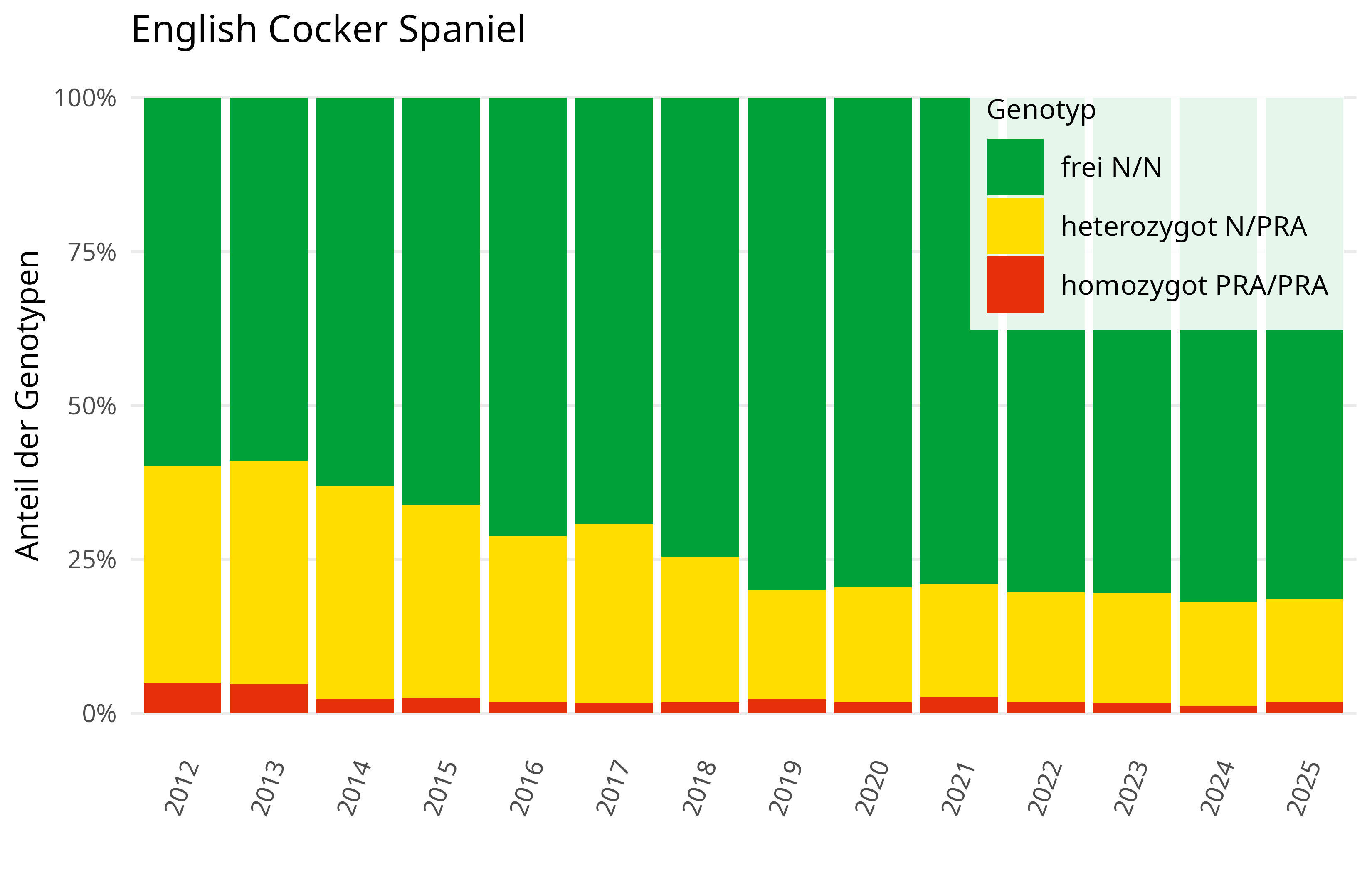 Auch beim Golden Retriever zeigt sich eine positive Entwicklung (siehe Abb. 3). Mit über 10.000 getesteten Tieren sank die Rate der Träger in der Population deutlich schneller als beim Labrador. In den letzten 10 Jahren wurden keine betroffenen Tiere mehr gefunden, und die Trägerquote liegt stabil bei etwa 1–2 % der Gesamtpopulation. Beim English Cocker Spaniel halbierte sich der Anteil der Träger und betroffenen Tiere seit 2012 (Abb. 4). Dennoch kommen weiterhin betroffene Tiere vor, weshalb es empfohlen wird, Elterntiere vor der Zucht auf ihren prcd-PRA Status zu testen, um PRA/PRA Kombinationen auszuschließen.