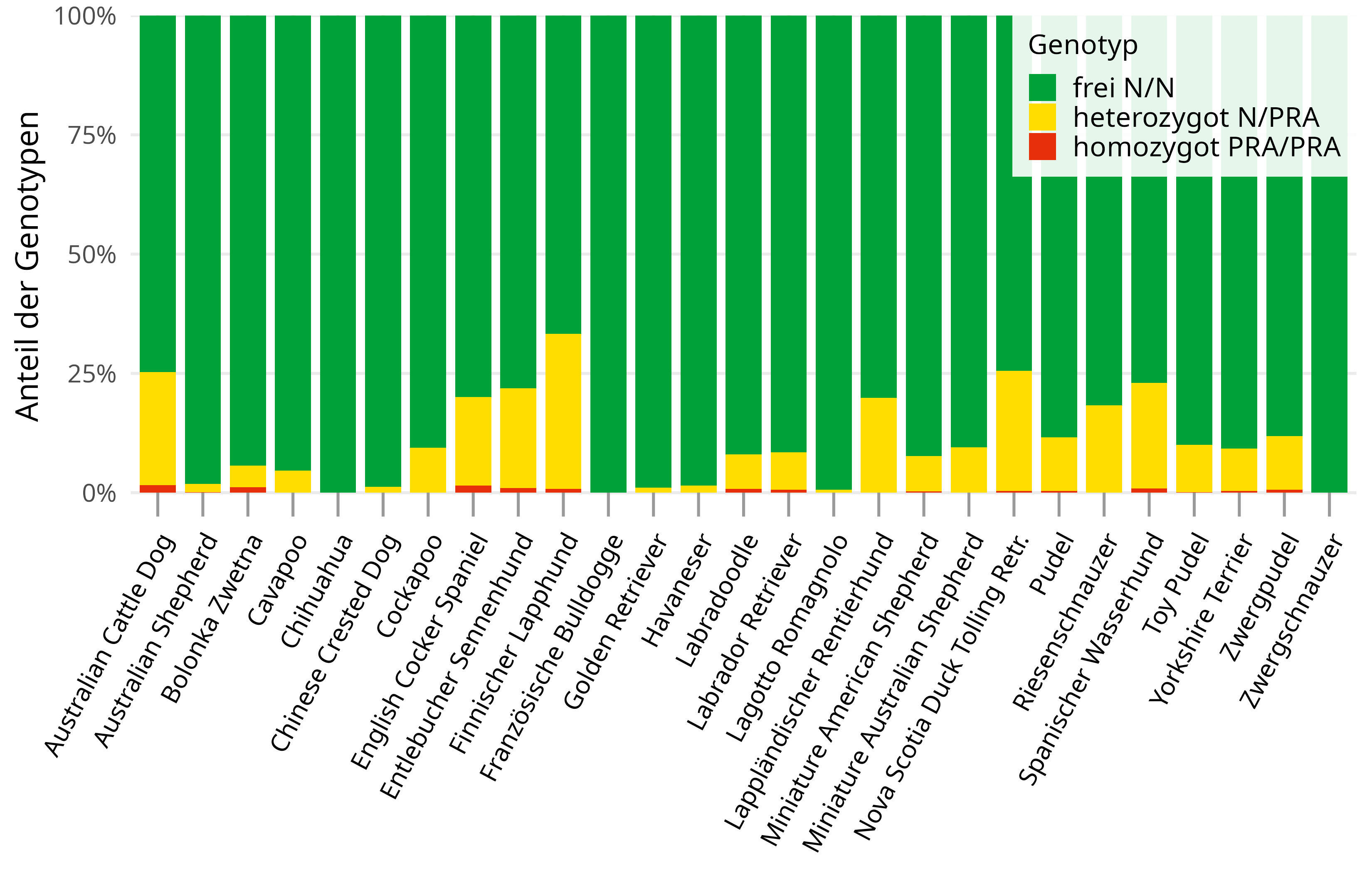 Es zeigt sich bereits im Vergleich dieser drei Rassen, dass die prcd-PRA Variante unterschiedlich häufig vorkommt. Eine aktuelle Auswertung der Daten von 2024 und 2025 gibt einen Überblick über die Genotypenverteilung in 27 Hunderassen und Rassevarietäten. Dabei wurden nur Populationen berücksichtigt, bei denen mindestens 100 Tiere getestet wurden (Abb. 5).