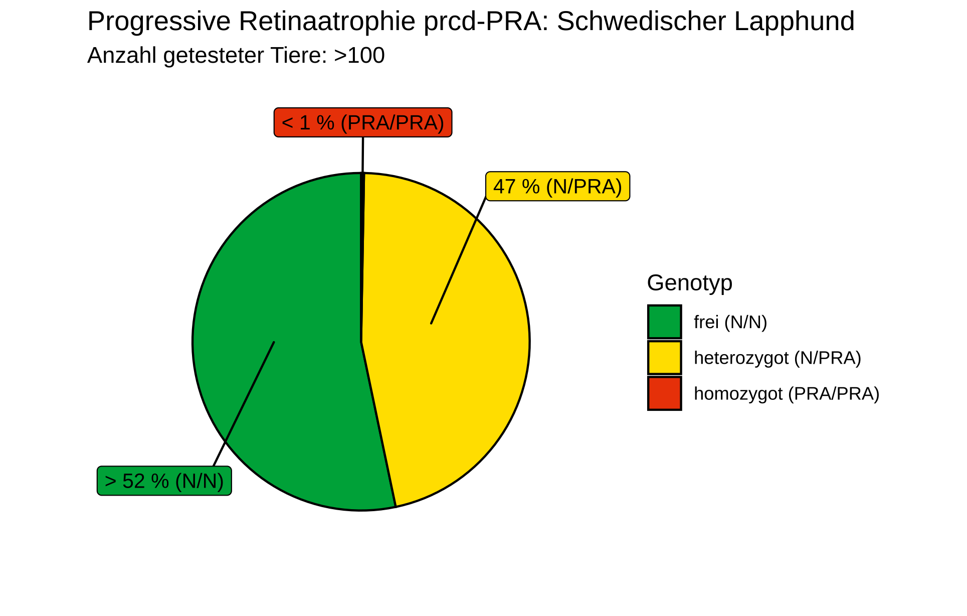 Es gibt Rassen wie Chihuahua, Französische Bulldogge und Zwergschnauzer, bei denen in den letzten zwei Jahren ausschließlich freie Genotypen gefunden wurden. Das bedeutet natürlich nicht, dass die Variante in keinem Tier der Rasse mehr vorkommt, aber die Wahrscheinlichkeit eines Trägers und insbesondere eines betroffenen Tieres ist extrem gering. Mit Ausnahme des Finnischen Lapphunds, des Nova Scotia Duck Tolling Retrievers und des Australian Cattle Dogs findet sich keine Rasse, bei der mehr als 25 % der Tiere Träger oder betroffen für die prcd-PRA Variante sind. Besonders erfreulich ist, dass die Zahl der homozygot betroffenen Tiere in allen Rassen sehr gering ist, da nur diese Tiere klinische Symptome entwickeln. Besonders in Rassen mit kleinen Zuchtpopulationen ist es weiterhin relevant, bewusst Träger-Träger-Verpaarungen zu vermeiden. Beim Schwedischen Lapphund sind aktuell 47 % der analysierten Tiere Träger der prcd-PRA Variante (siehe Grafik, Datengrundlage 2021-2025). Bei einer kleinen Population wäre ein Ausschluss der Träger riskant, da dies zu Inzuchtdepression und einem Verlust genetischer Diversität führen würde. Dennoch gelingt es durch gezielte Verpaarung mit freien Tieren, dass keine betroffenen Tiere gezüchtet werden. Dies unterstreicht, wie entscheidend konsequente genetische Testung und eine bewusste Zuchtplanung sind.