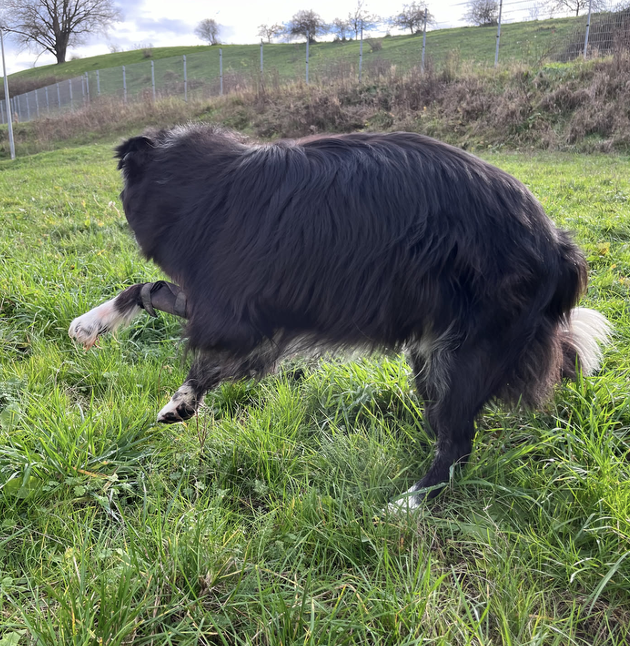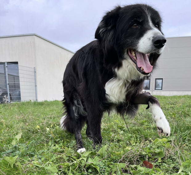 Merlin, ein achtjähriger Border Collie, lebt auf einem Reiterhof läüft in ein Auto und verletzt sich schwer. An der rechten Vorderpfote scheint es sich zunächst um Probleme der Knochen zu handeln, die primär versorgt werden. Während der Heilungsphase wird aber immer deutlicher, dass Merlin das geschädigte Bein wohl nicht mehr nutzen wird: Die gesamte sensible und motorische Innervation der betroffenen Gliedmaße ist geschädigt. Die Muskulatur verkümmert und er ist fortan dreibeinig unterwegs, was für mehrere Jahre ohne Probleme möglich ist. Die Belastung des linken Vorderbeins führt mit der Zeit aber zu deutlichen, degenerativen Prozessen und damit verbundenen Schmerzen. Die eingesetzten üblichen Medikationen, Merlin hat Erfahrung mit einer Vielzahl von NSAIDs, wirken zwar adäquat, die Nebenwirkungen bereiten mit der Zeit aber zunehmend Probleme. In diesem Zustand lernen wir den aufgeweckten Rüden kennen. Zum Zeitpunkt der Erstvorstellung in der Strahlentherapie ist er 10,5 Jahre.