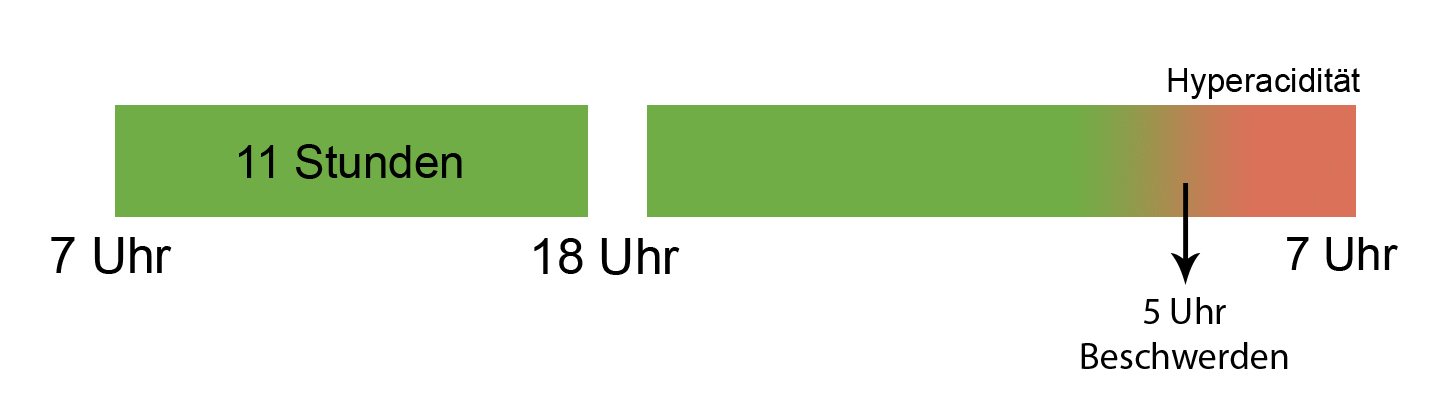 Berichtet der Besitzer, dass sein Tier nur zweimal täglich gefüttert wird, ist die Phase der Nüchternheit über Nacht sehr lang. Bei einer Fütterung um 7 Uhr morgens und um 18 Uhr abends ist der Hund oder die Katze über Nacht für 13 Stunden nüchtern. Diese lange Phase der Nüchternheit kann zu der nächtlichen Hyperacidität und den Beschwerden in der Nacht führen. Der Zeitpunkt und das Auftreten der Beschwerden sind abhängig vom Zeitpunkt der Fütterung. Die Beschwerden würden in diesem Beispiel wahrscheinlich nachts elf Stunden nach der letzten Fütterung gegen 5 Uhr auftreten.